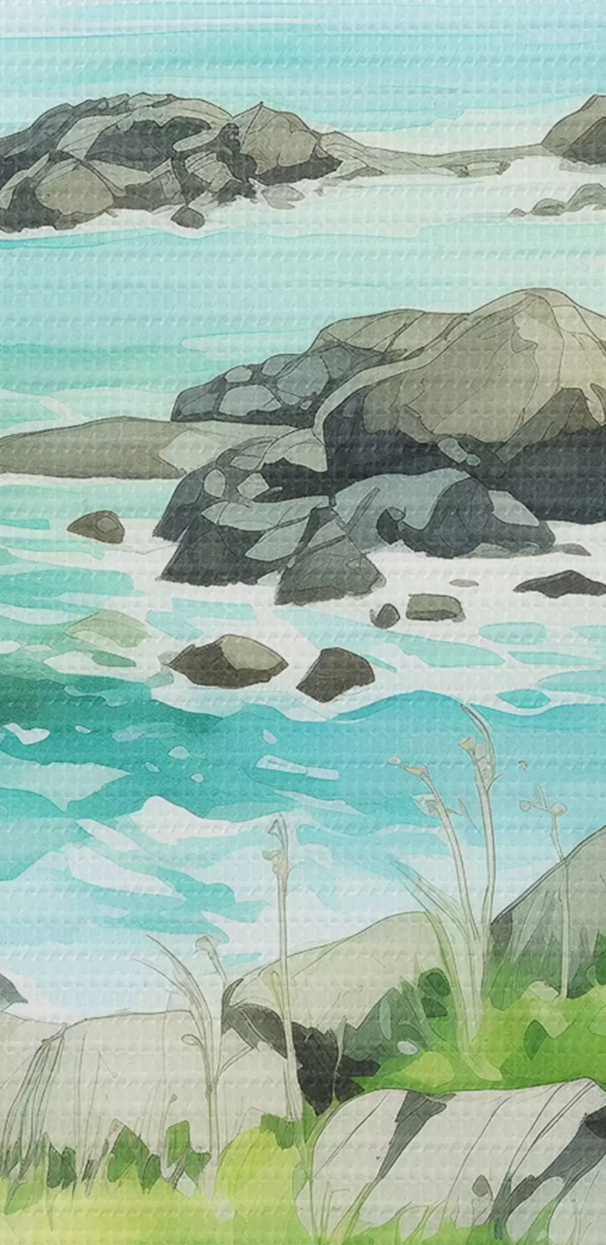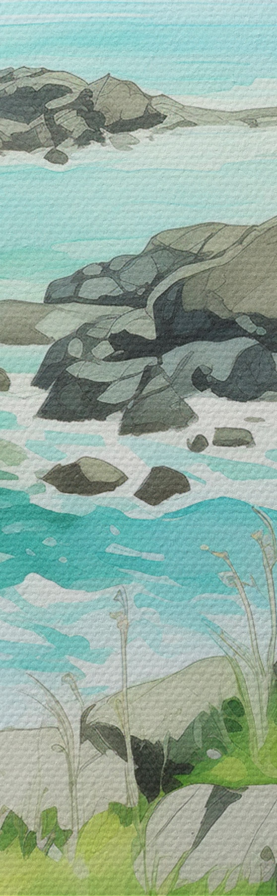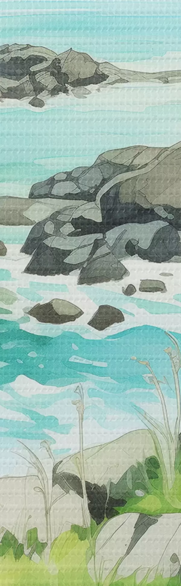 Glezna Norvēģija daba, fjordi, vasaras ainava, zaļa zāle, kalni, akvareļu stils s43188