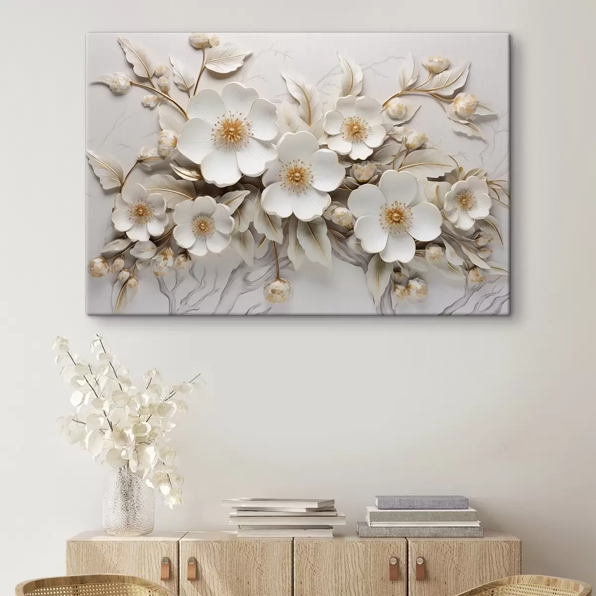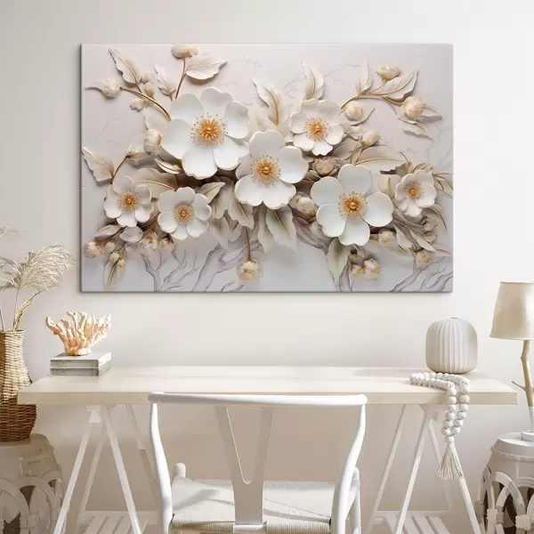 Glezna 3D balti ziedi klasiskā stilā ar dzeltenu akcentu s43313
