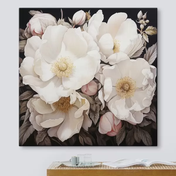 Glezna Balti peoniju ziedi uz tumša fona akrila glezniecības stilā s43379