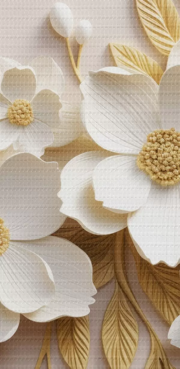 Glezna 3D balti ziedi ar lapām uz krēmkrāsas fona Nr s43383