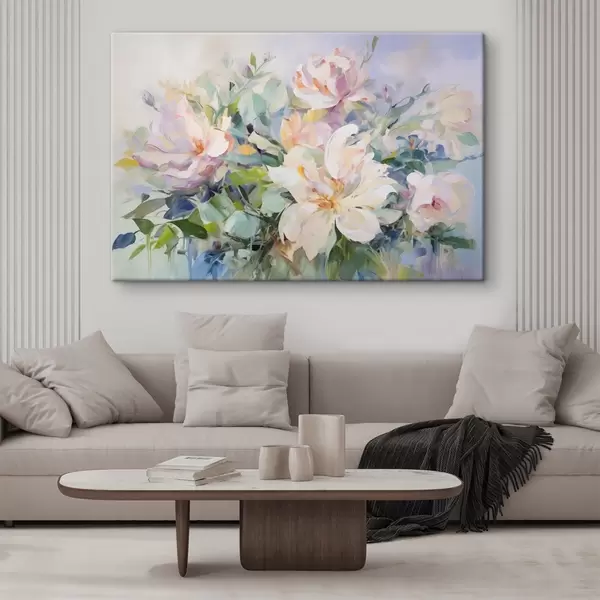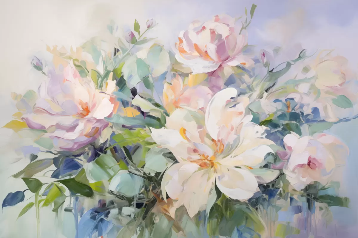 Glezna Ziedu kompozīcija ar pasteļkrāsas ziediem ar zilām lapām, eļļas glezniecības imitācija Nr s43390