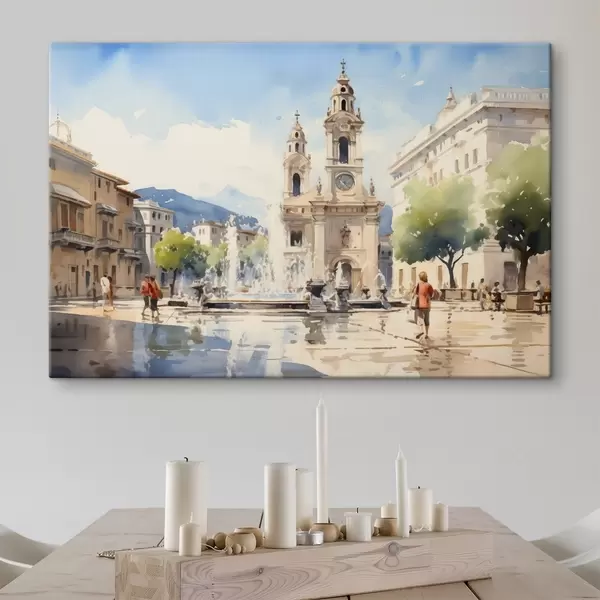 Glezna Abstraktā pilsētas ainava ar torni un strūklaku pilsētas laukumā, kalni tālumā, akvareļa stilā s43397