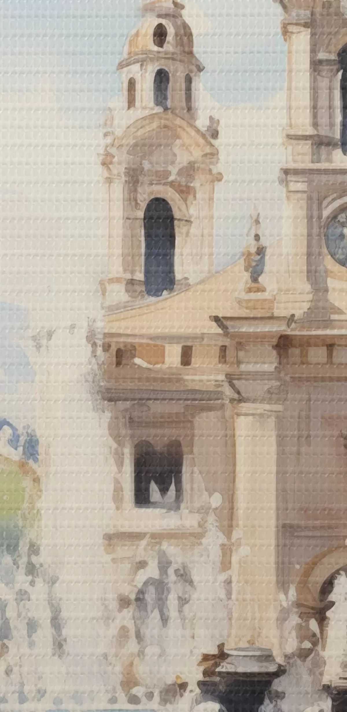 Glezna Abstraktā pilsētas ainava ar torni un strūklaku pilsētas laukumā, kalni tālumā, akvareļa stilā Nr s43397