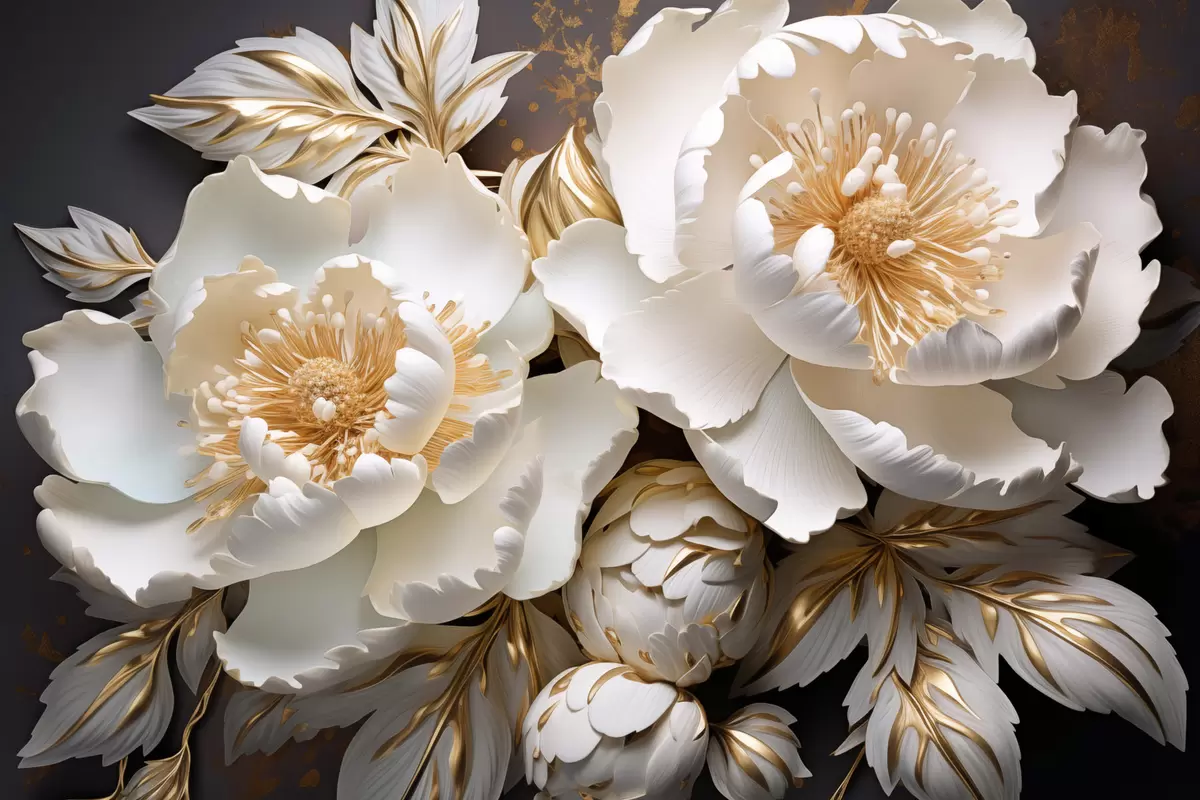 Glezna Baltas un dzeltenas peonijas ar lapām, sarežģītas detaļas, dekoratīvā māksla, tumšs fons s43399