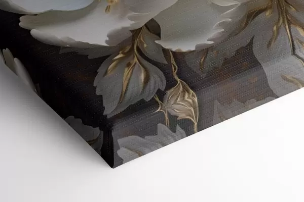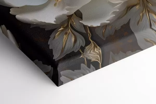 Glezna Baltas un dzeltenas peonijas ar lapām, sarežģītas detaļas, dekoratīvā māksla, tumšs fons s43399