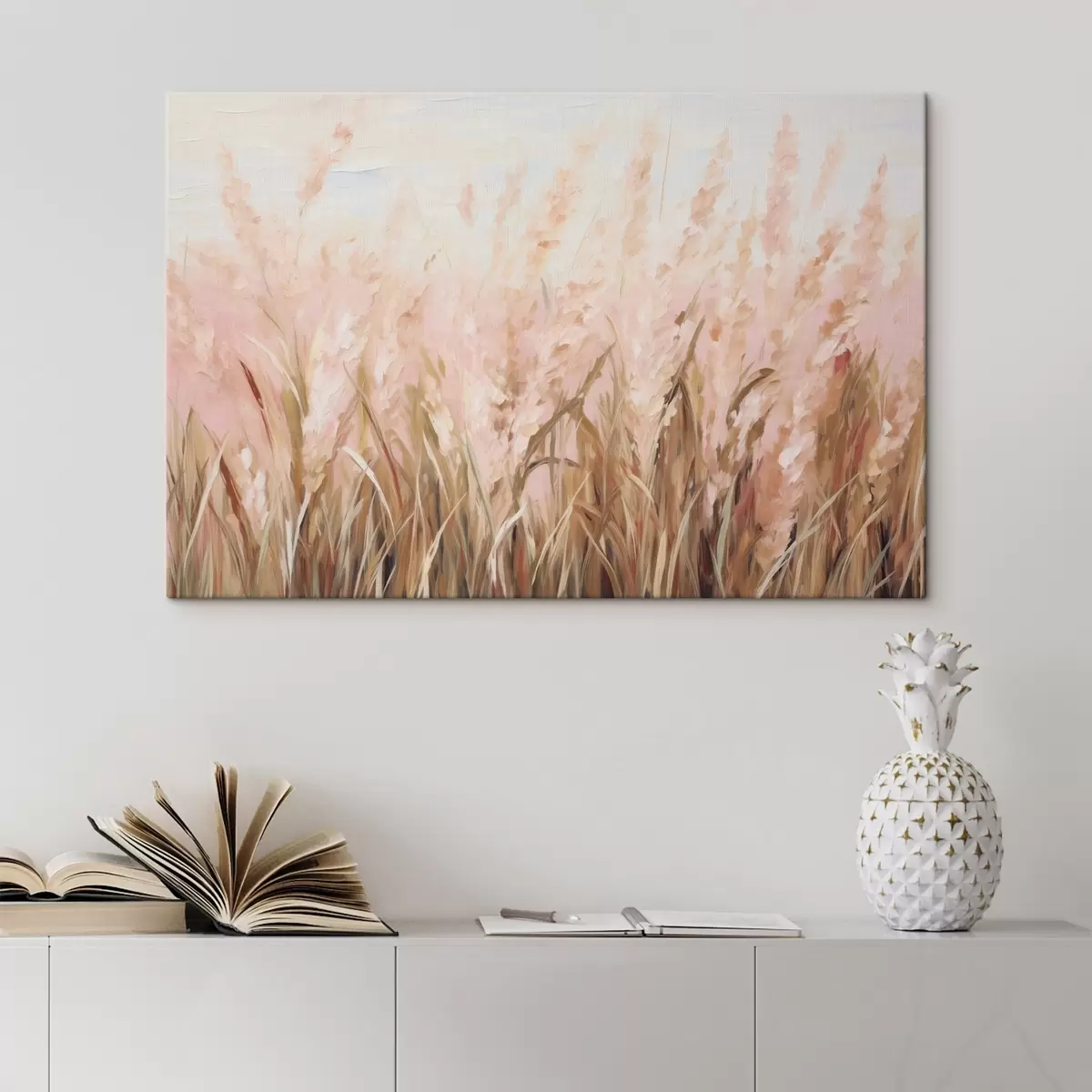 Glezna Pampas zāliena lauks ar rozā un brūniem toņiem, mīksti triepieni ar otu, abstraktā eļļas glezna mākslas imitācija Nr s43403
