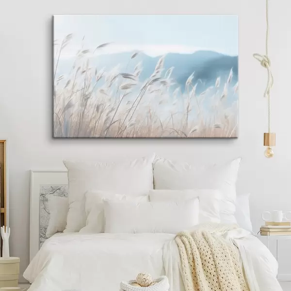Glezna Zāle, pampas lauks ar zilu kalnu fonā, gaiši zilas debesis, minimālisma, pasteļtoņi Nr s43404