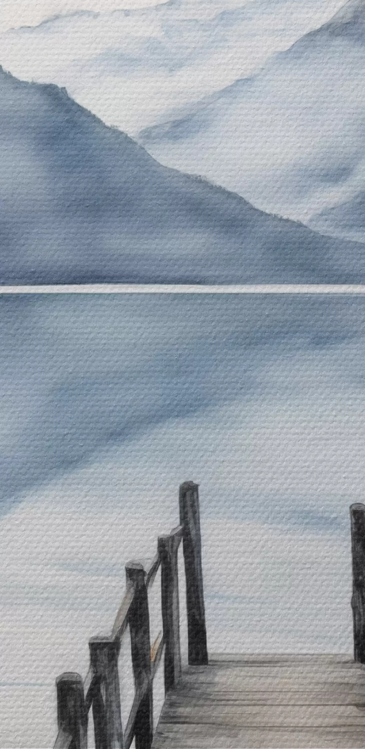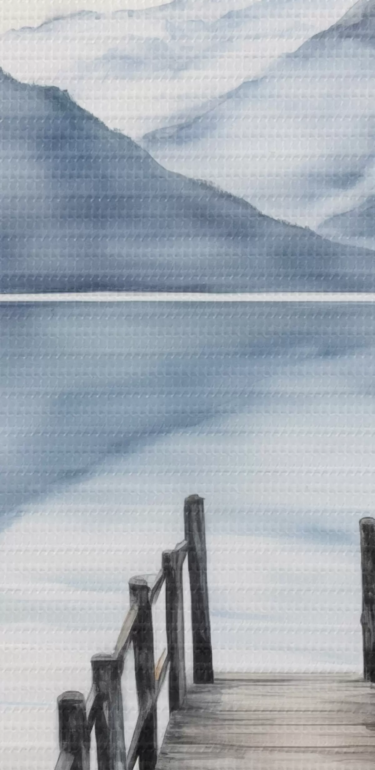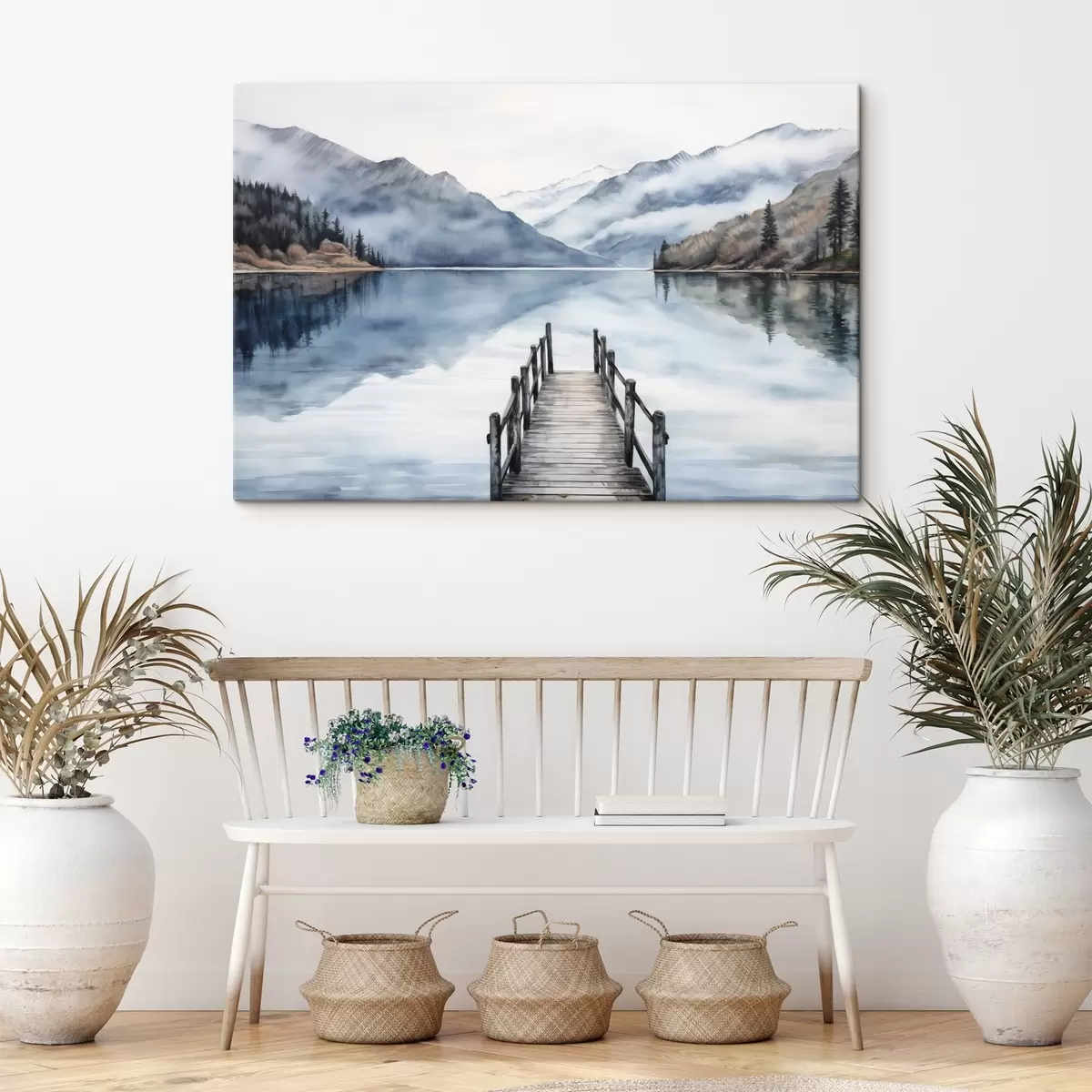 Glezna Akvareļu stilā akvareļu stilā veidota koka piestātne stiepjas uz klusu ezeru, ko ieskauj kalni un mūžzaļi koki Nr s43405