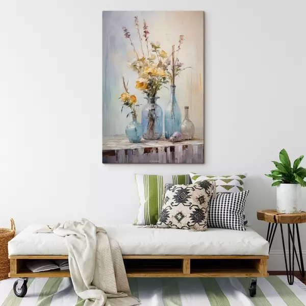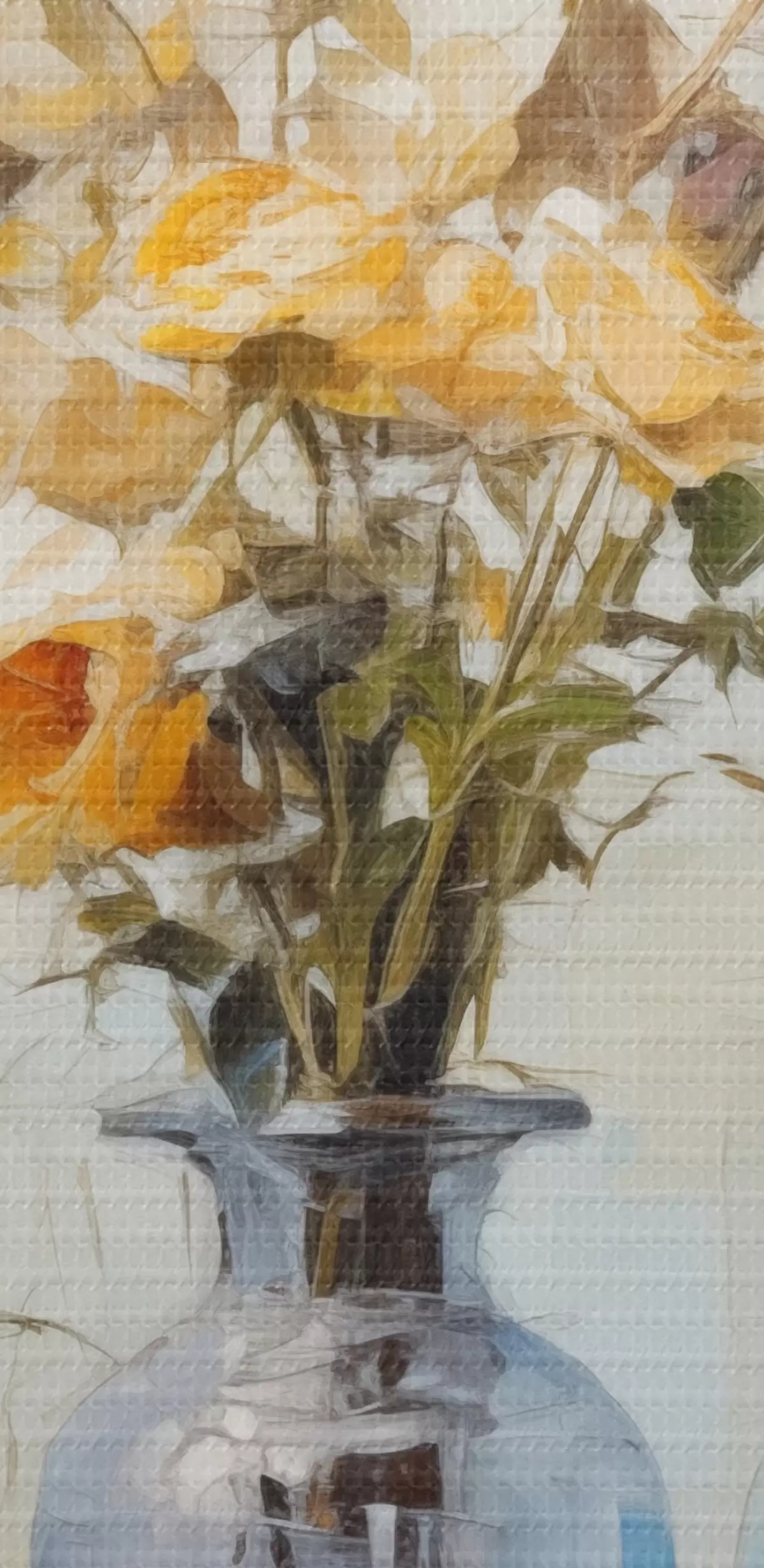 Glezna Dzeltenu rožu klusā daba zilās stikla vāzēs, viegls teksturēts fons, maigi triepieni ar otu, eļļas glezniecības stilā Nr s43409