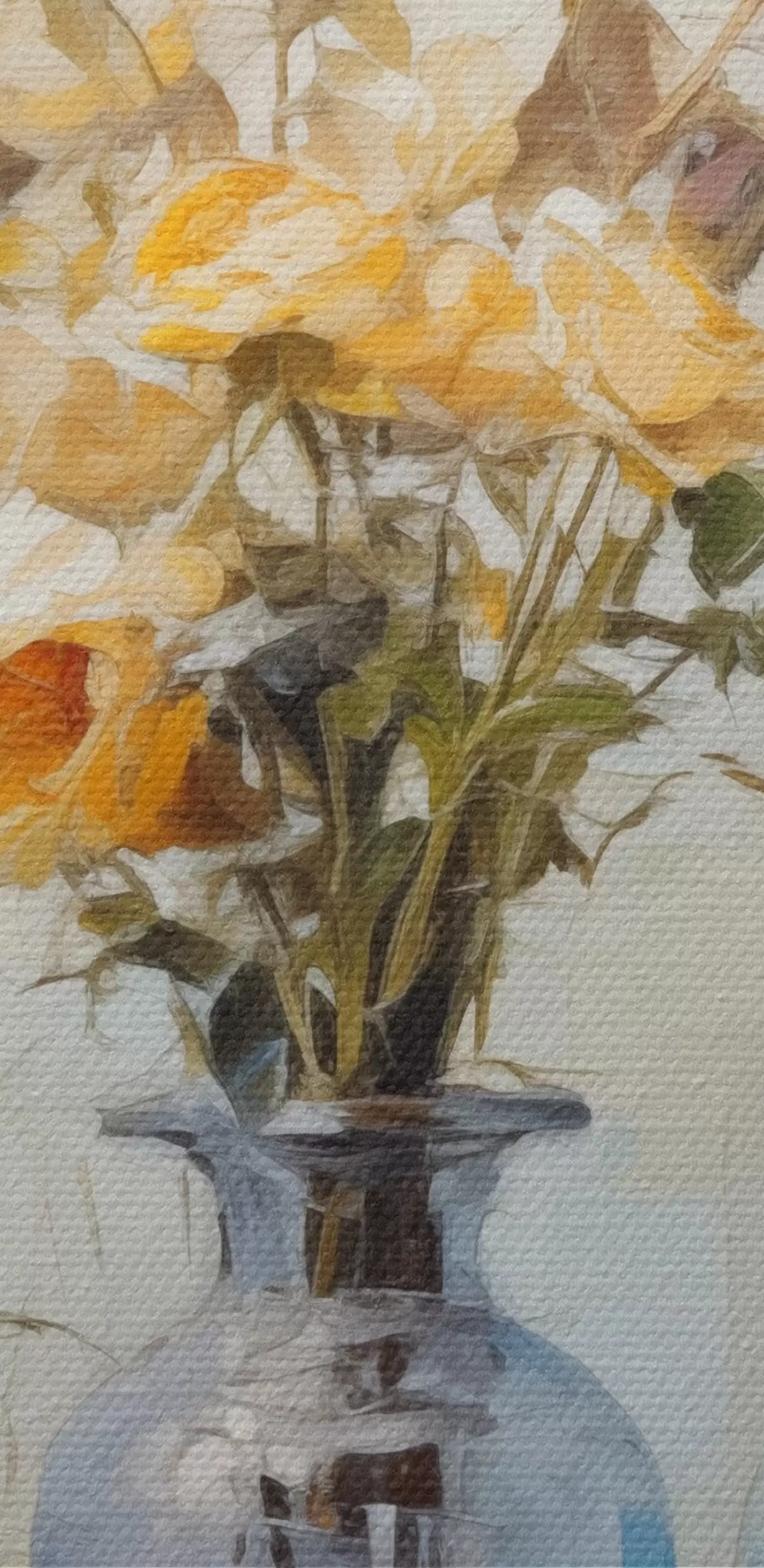 Glezna Dzeltenu rožu klusā daba zilās stikla vāzēs, viegls teksturēts fons, maigi triepieni ar otu, eļļas glezniecības stilā s43409