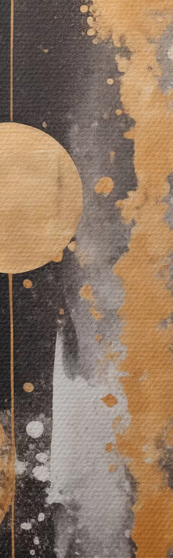 Glezna Abstraktā māksla ar dzelteniem apļiem, kas karājas uz melnā un baltā fona ar baltiem un dzelteniem plankumiem s43410