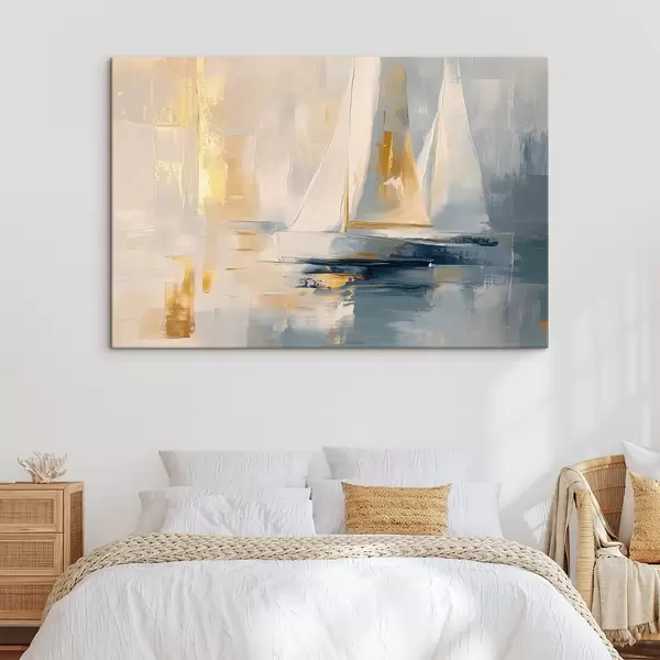 Glezna Abstrakcija ar buru laivām jūrā, akrila stilā, saulriets s43500