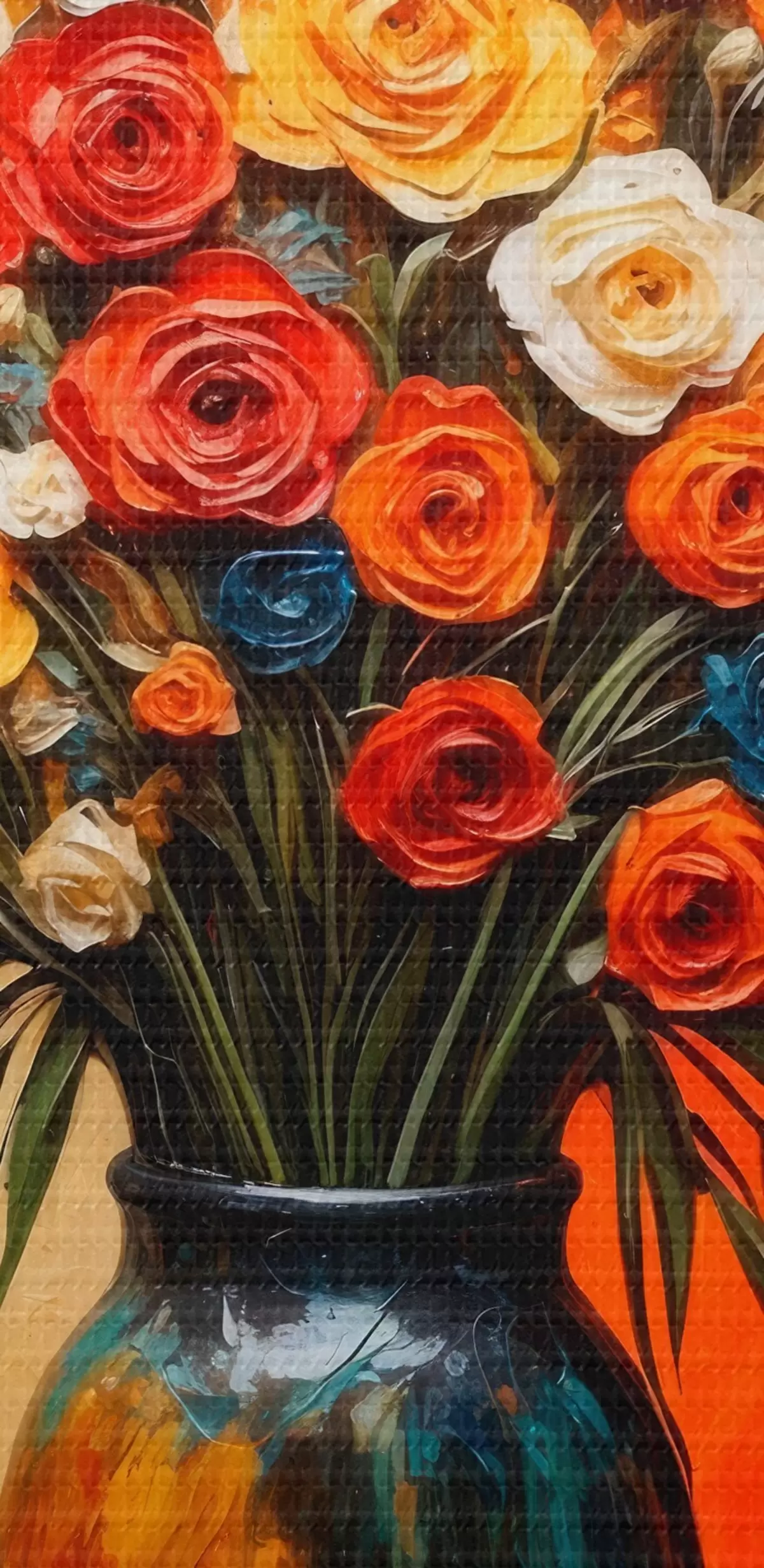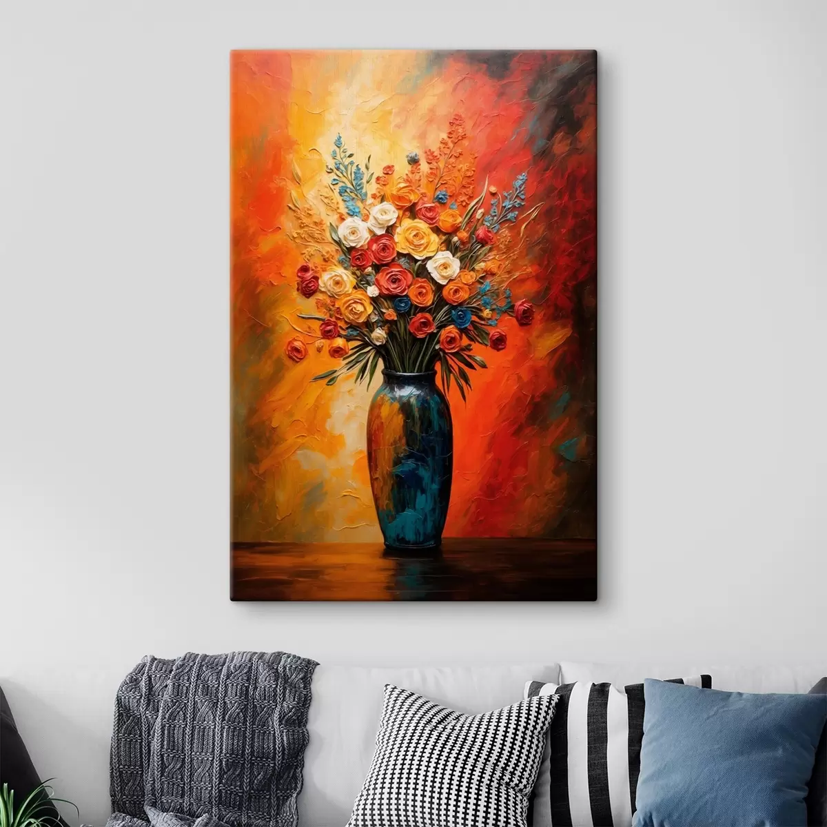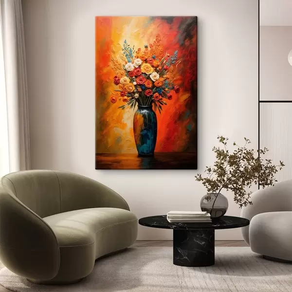 Glezna Dažādi ziedi vāzē uz sarkanīgi dzeltena fona Nr s43867