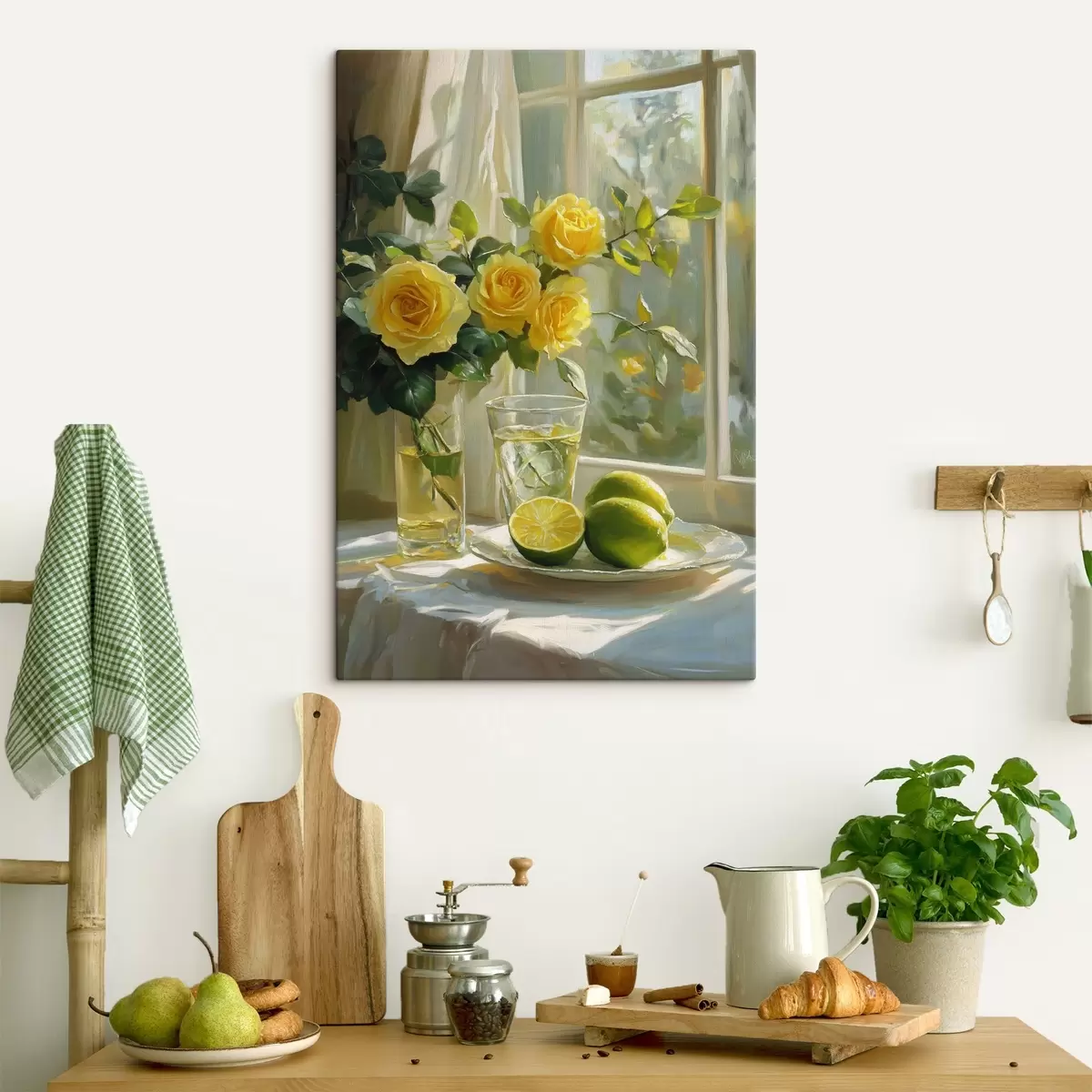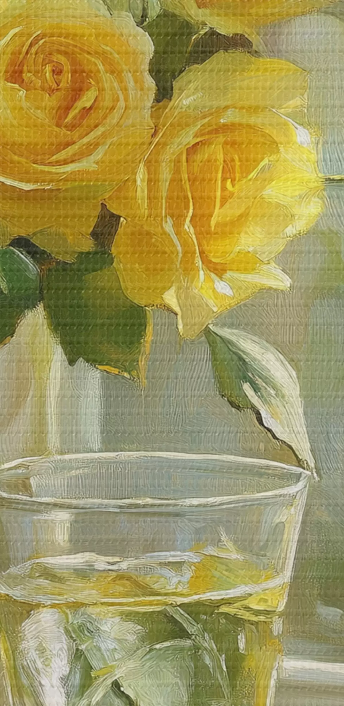 Glezna Skaistas dzeltenas rozes vāzē pie loga, ūdens ar laimi s43886