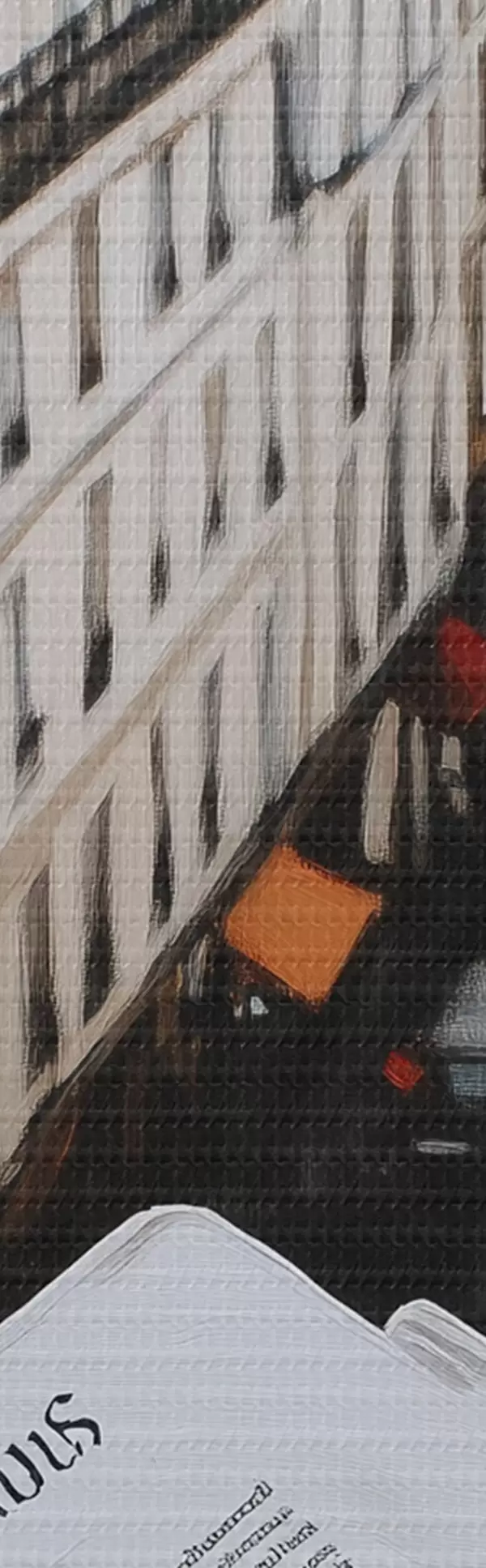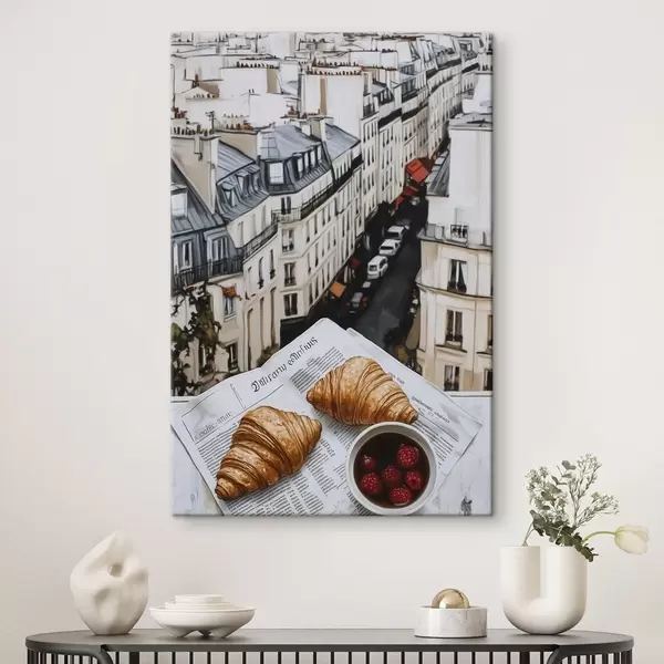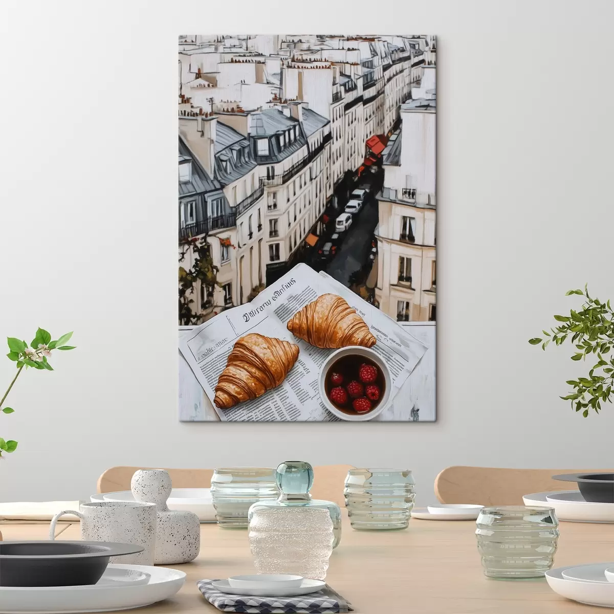 Glezna Rīta kafija ar kruasāniem, pilsētas iela, arhitektūra, eļļas stils Nr s43891