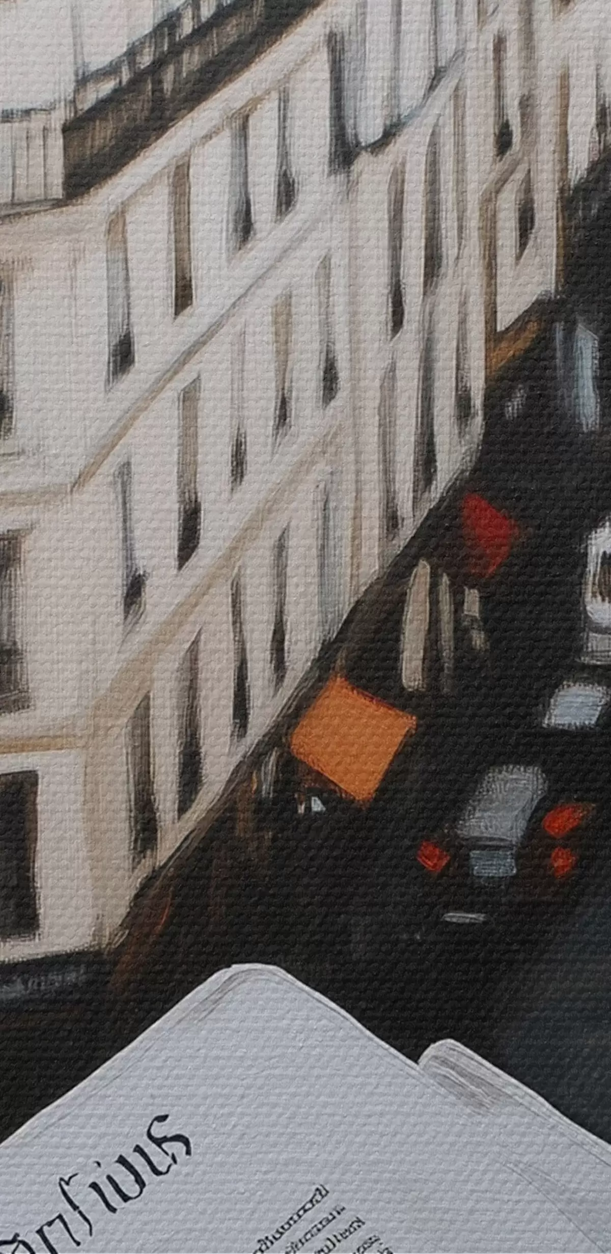 Glezna Rīta kafija ar kruasāniem, pilsētas iela, arhitektūra, eļļas stils s43891