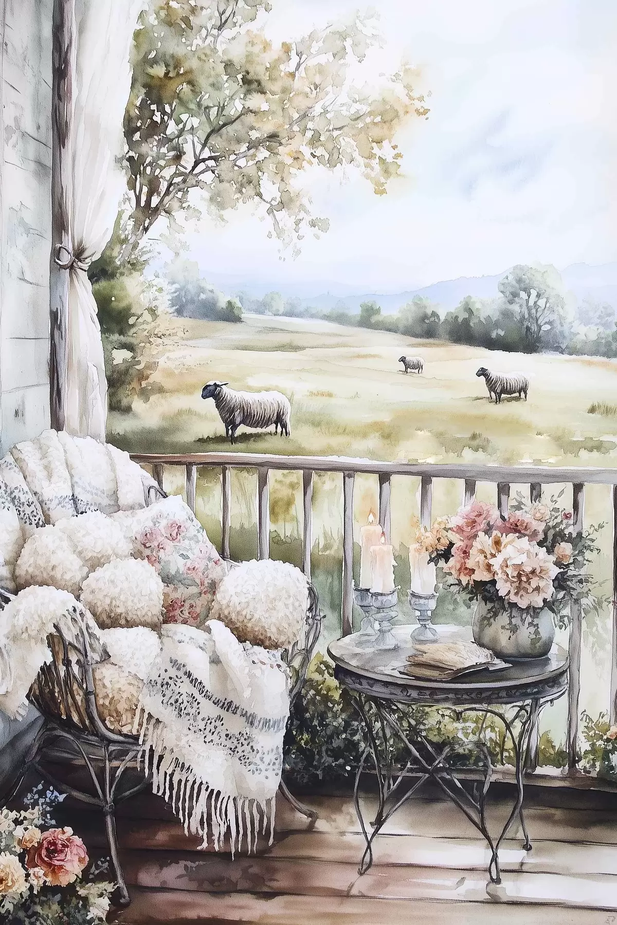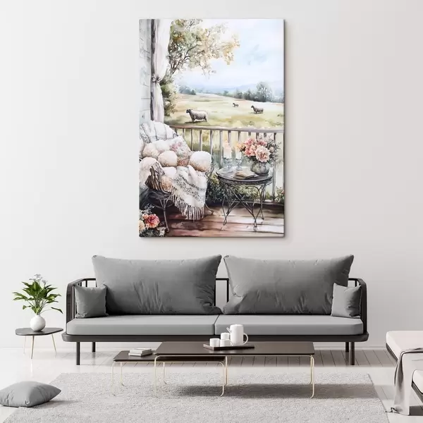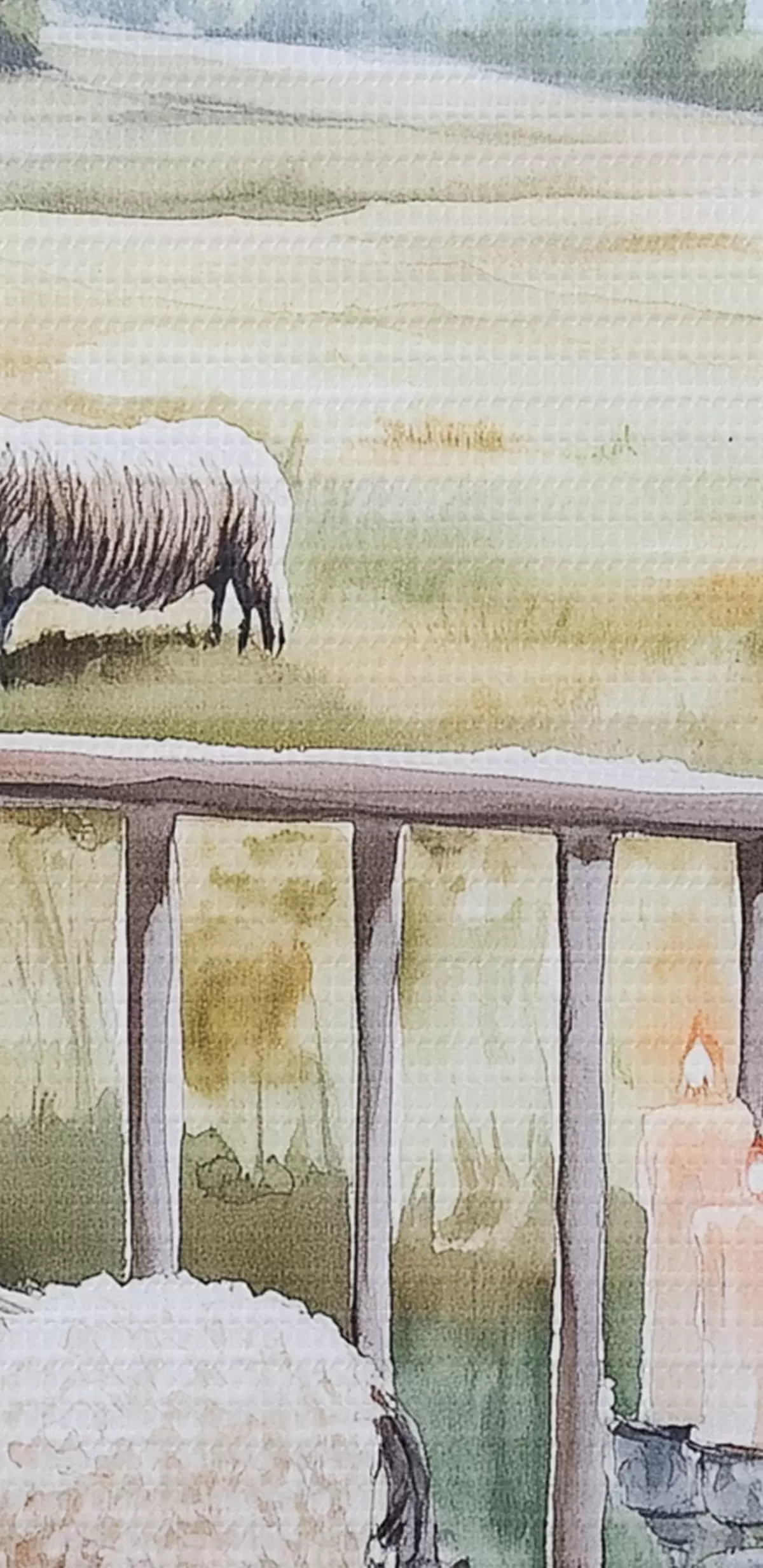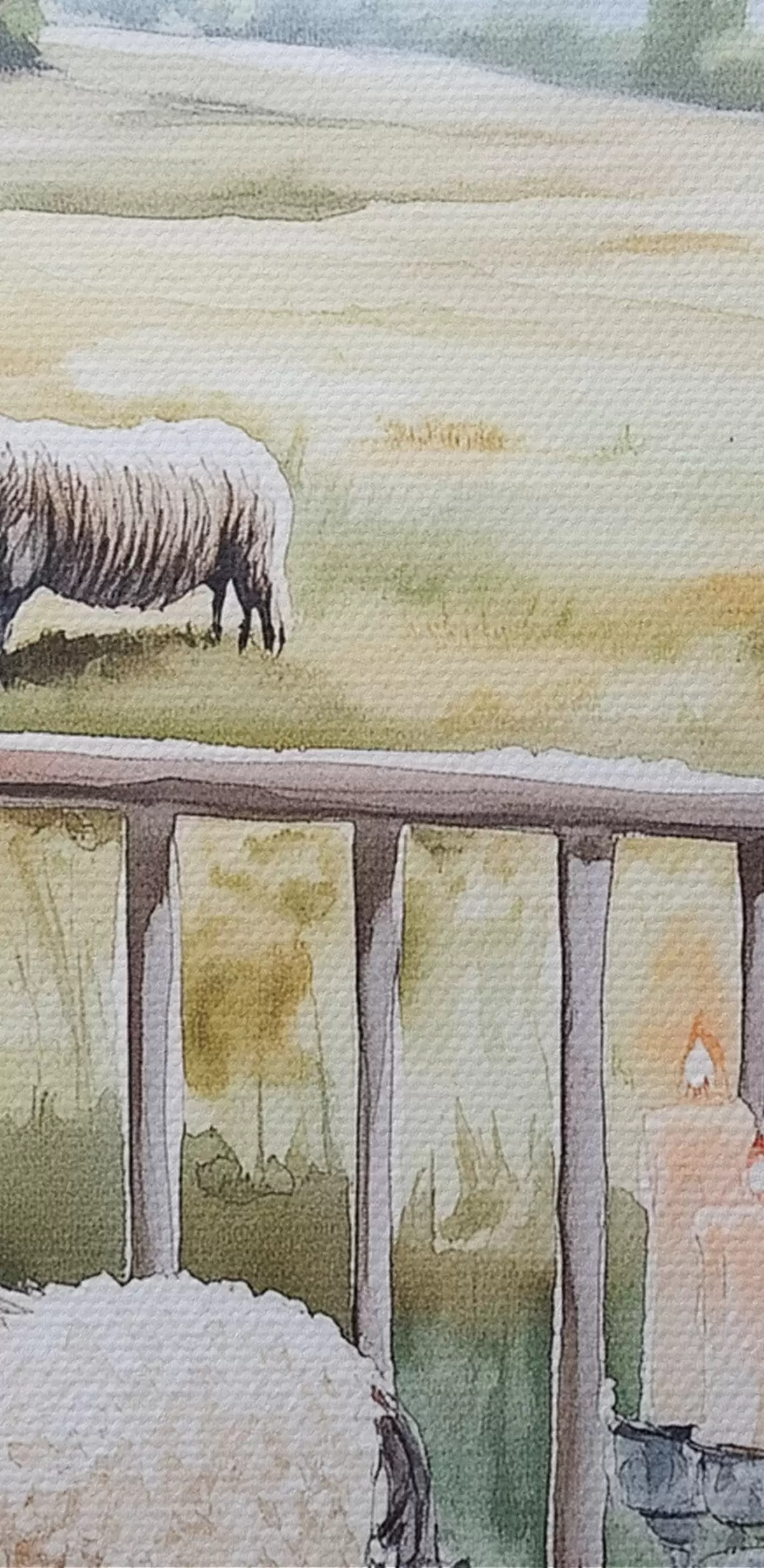 Glezna Lauku sēta ar aitām, laukiem, lauku puķēm, akvareļu stilā s44014