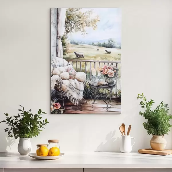 Glezna Lauku sēta ar aitām, laukiem, lauku puķēm, akvareļu stilā Nr s44014
