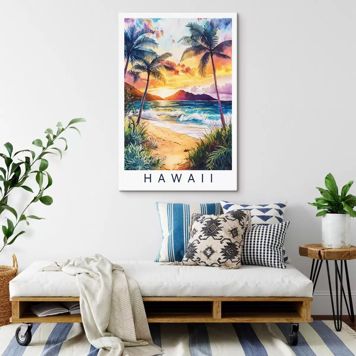 Glezna Saulriets Havaju salās, palmas, okeāns, krāsainas debesis, akvareļu stilā Nr s44142