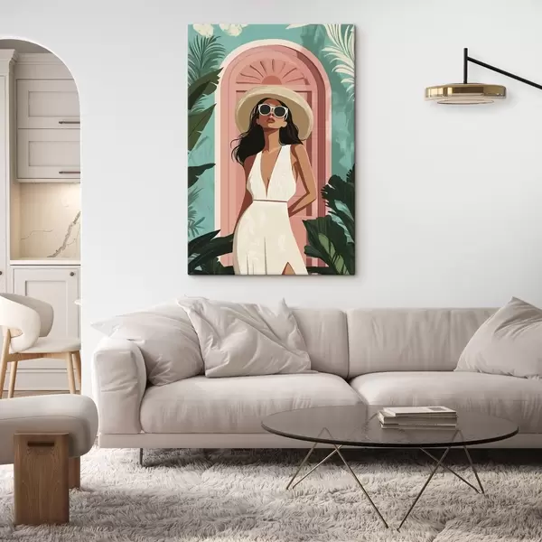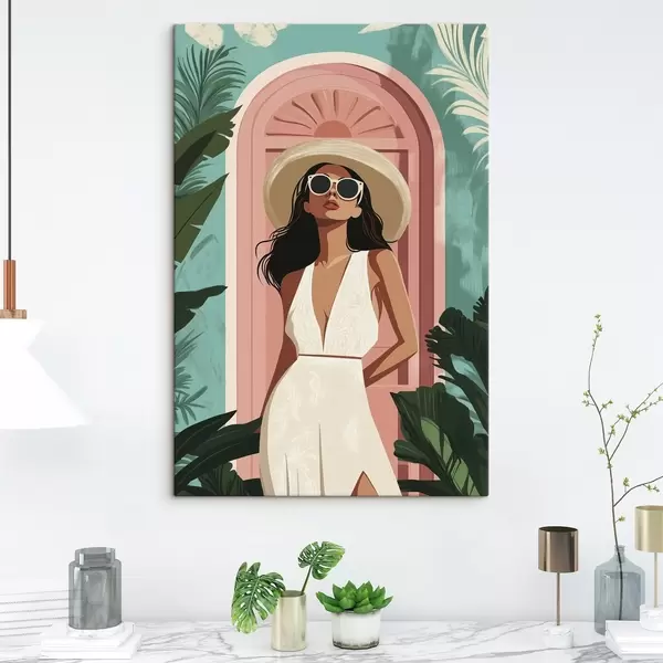 Glezna Sieviete ar saulesbrillēm un cepuri, tropu daba, arhitektūra Nr s44152