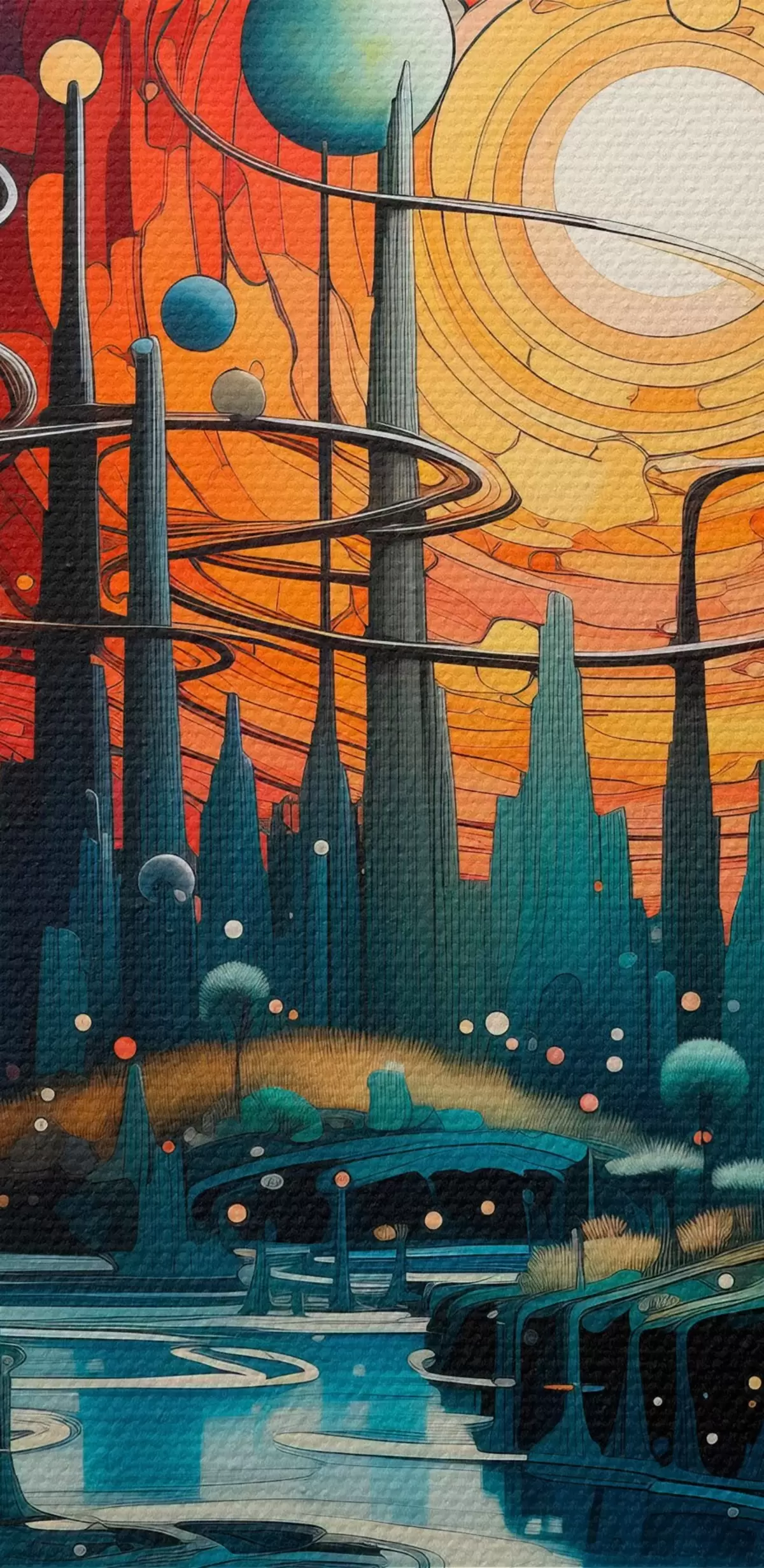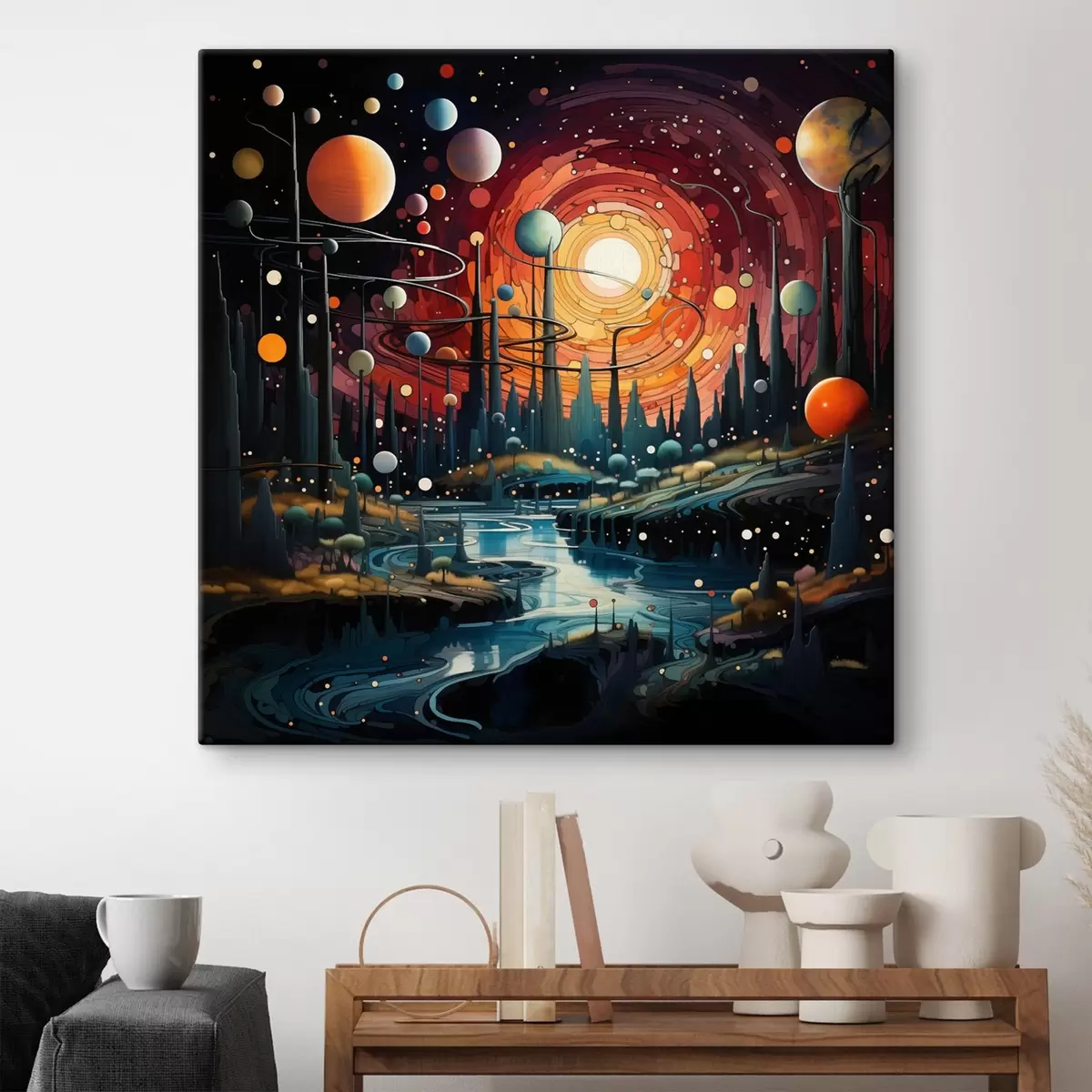 Glezna Spilgta un fantastiska svešzemju pasaules ainava ar planētām un upi Nr s44249