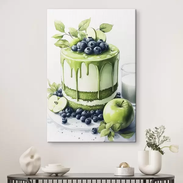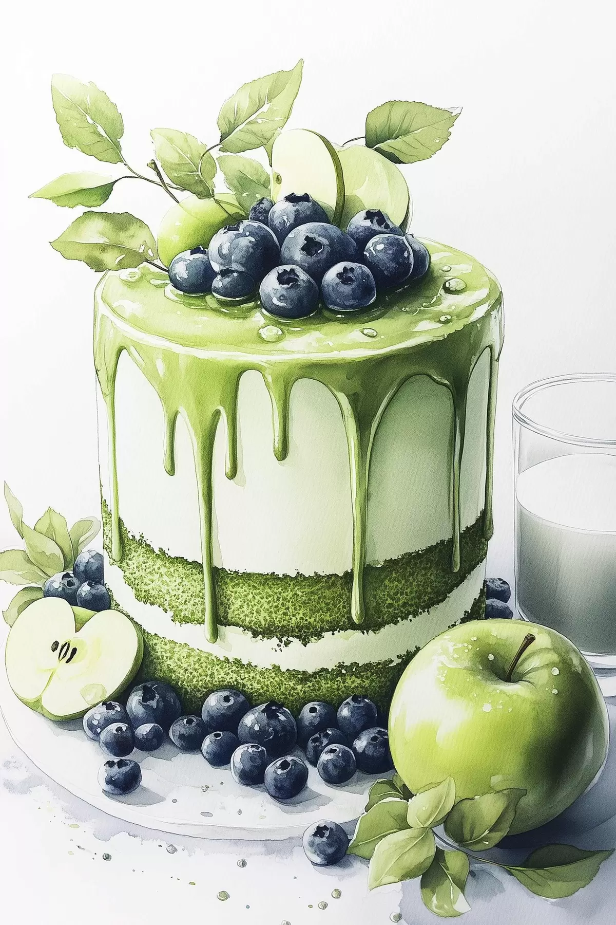 Glezna Matcha kūka ar mellenēm un āboliem, akvareļu stilā s44304