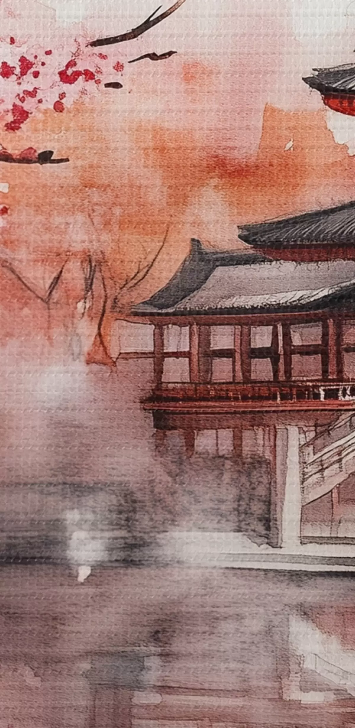 Glezna Skaista Japānas ainava ar ziedošu ķiršu koku un māju pie ezera Nr s44310