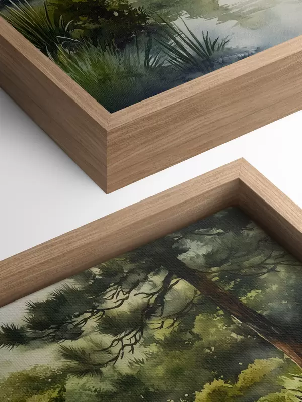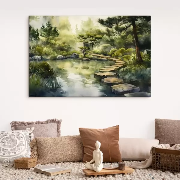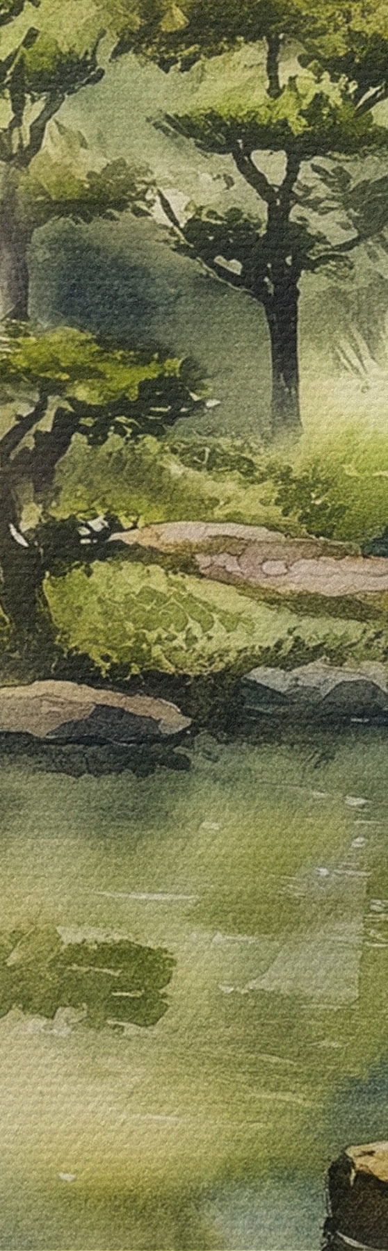 Glezna Austrumu mežs ar akmeņiem, dīķi un priedēm, zaļumi, akvareļu stilā s44311