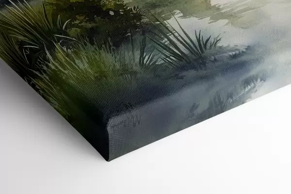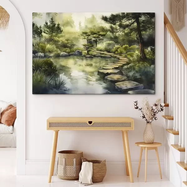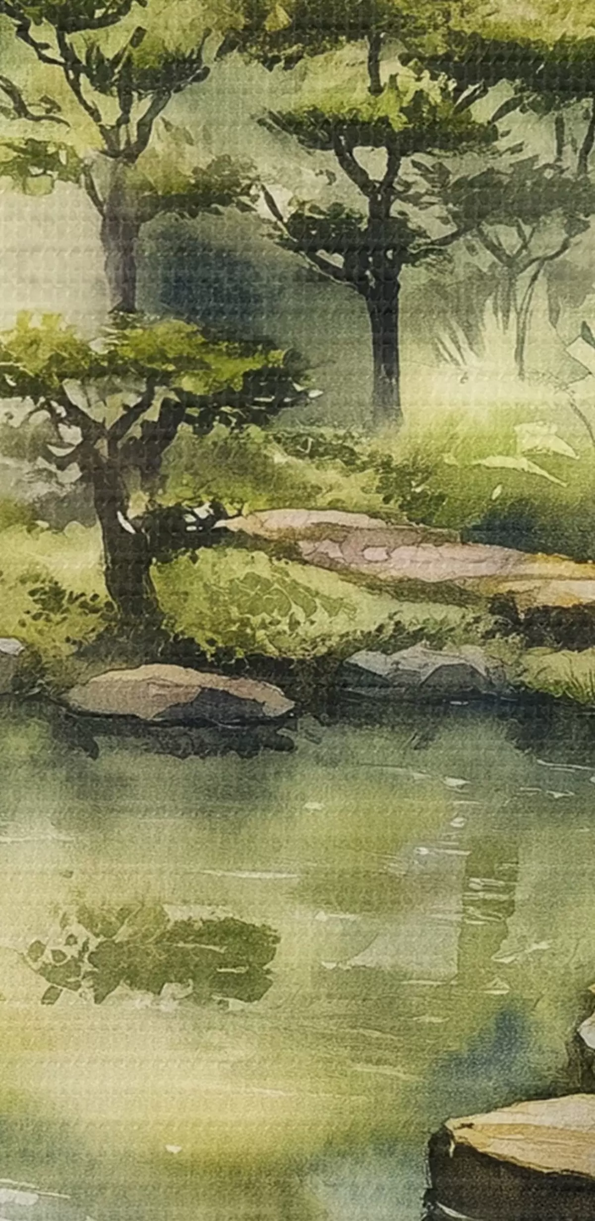 Glezna Austrumu mežs ar akmeņiem, dīķi un priedēm, zaļumi, akvareļu stilā s44311