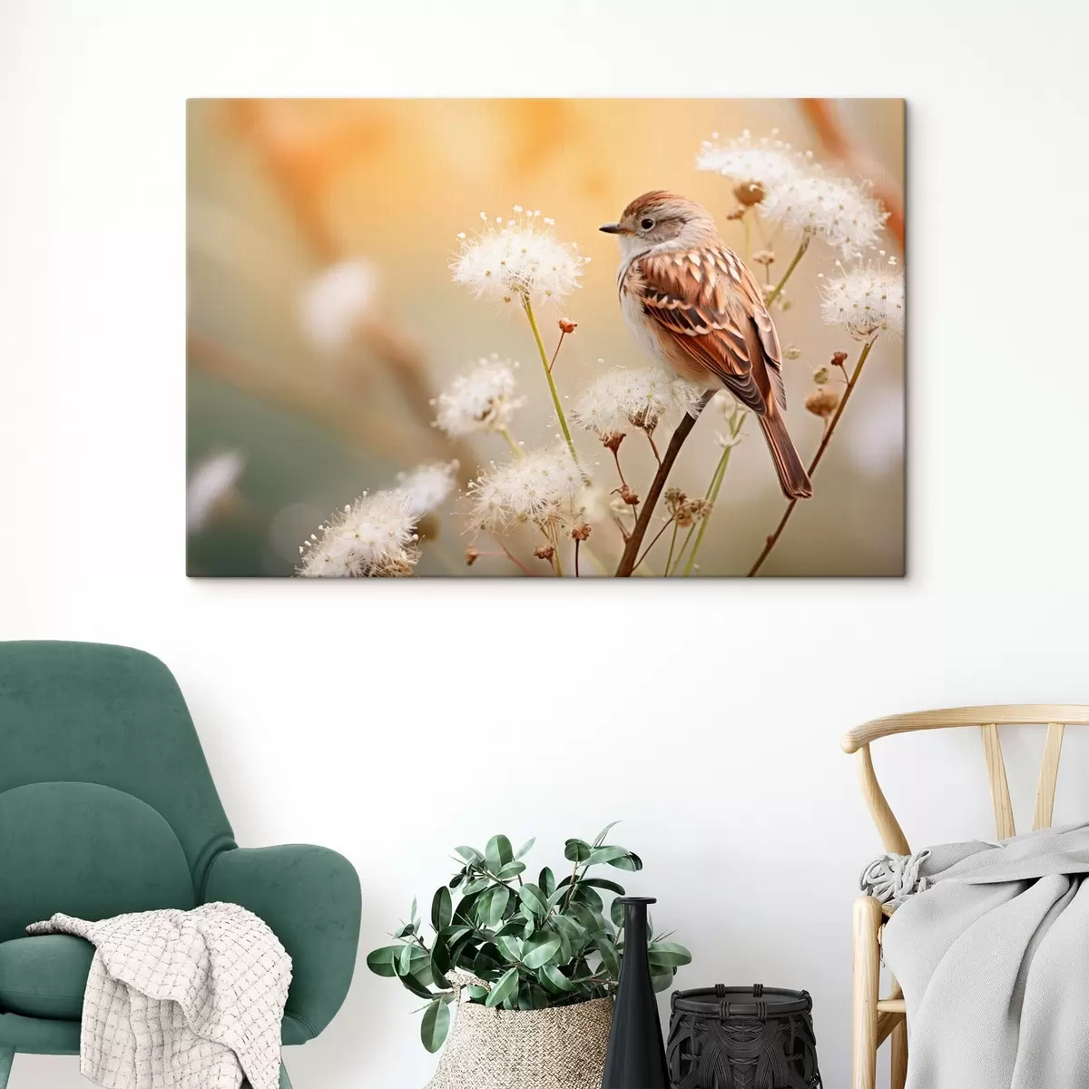 Glezna Putns, kas sēž uz zara ar baltiem ziediem, mīksts fokuss, dabas fons Nr s44393