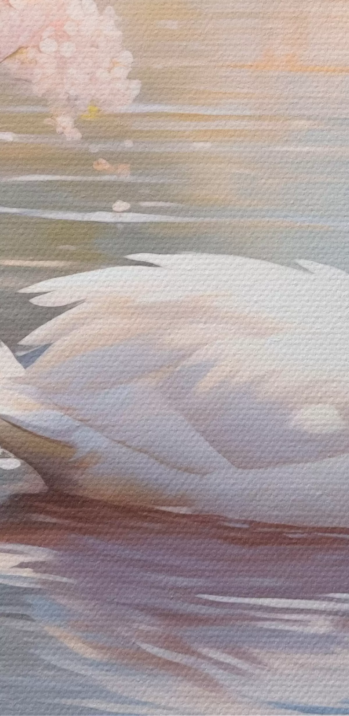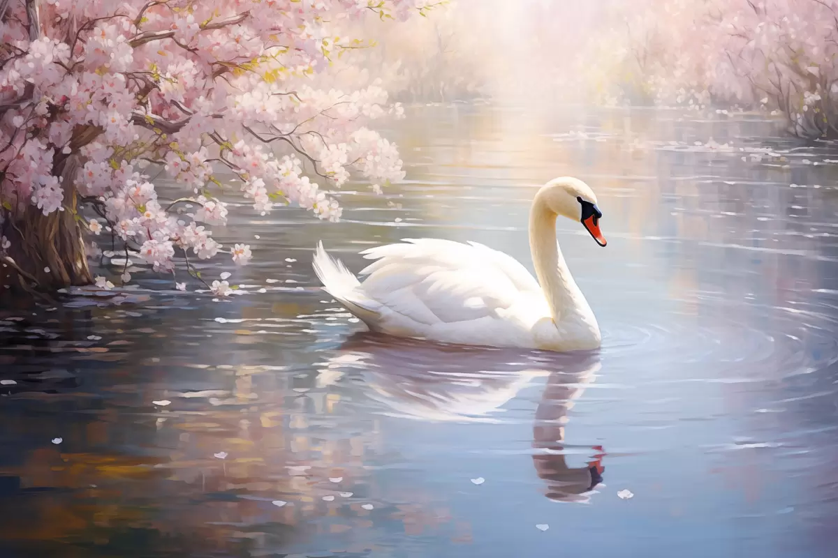 Glezna Balts gulbis peld ezerā ar ķiršu ziedošiem kokiem, pasteļtoņos Nr s44396