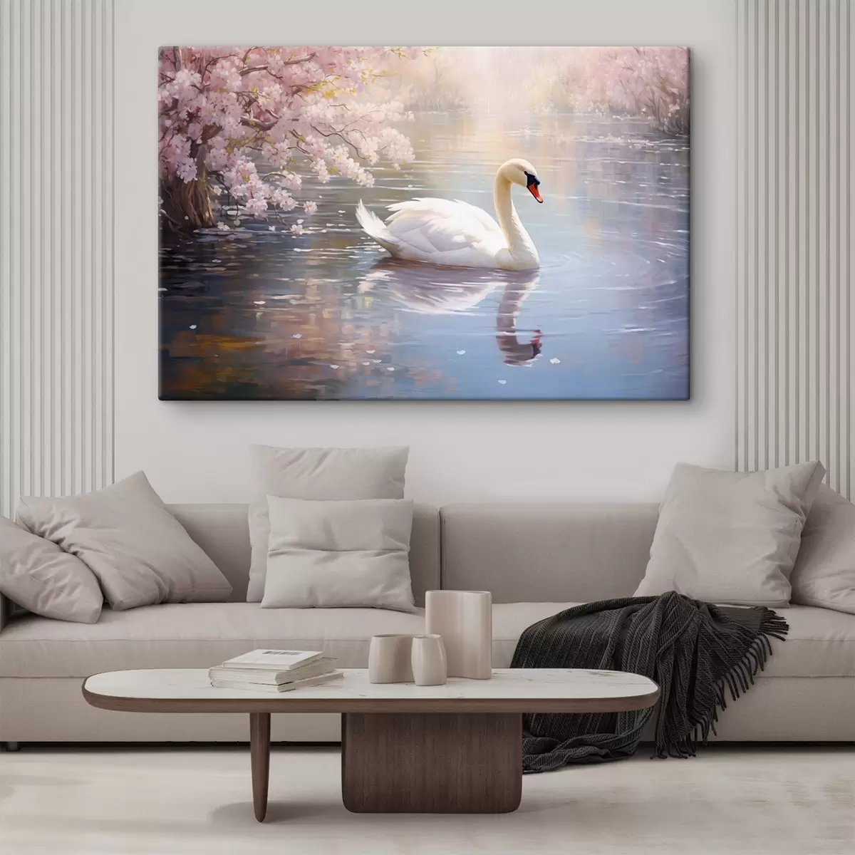 Glezna Balts gulbis peld ezerā ar ķiršu ziedošiem kokiem, pasteļtoņos s44396