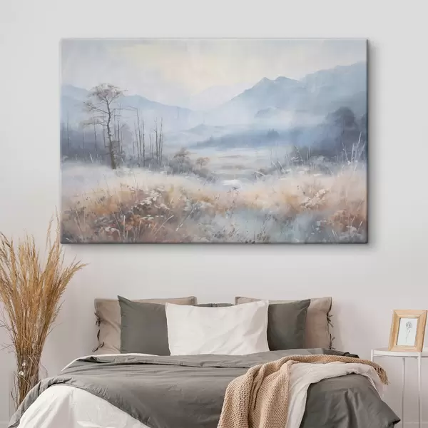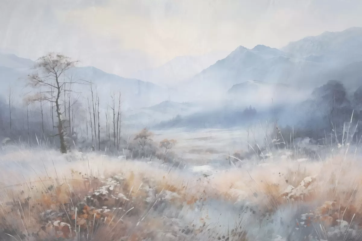 Glezna Teksturēta ainava ar kalniem, sausu zāli un mežu, pieklusinātas krāsas s44402