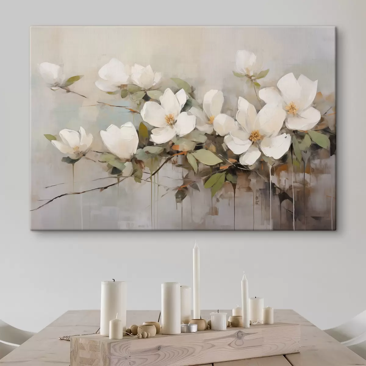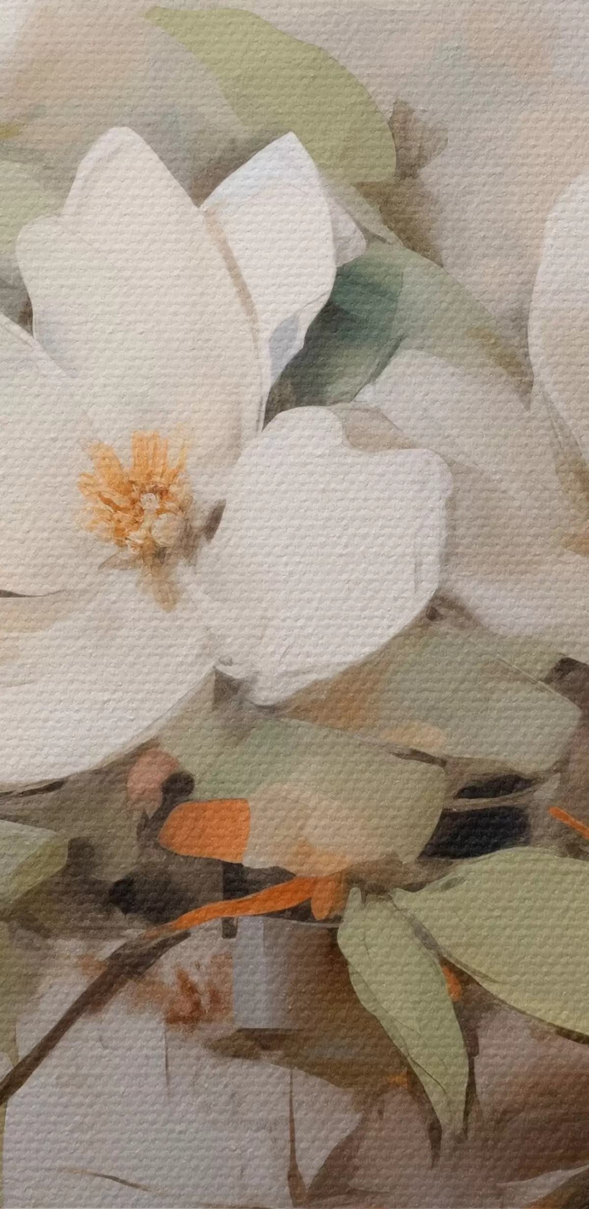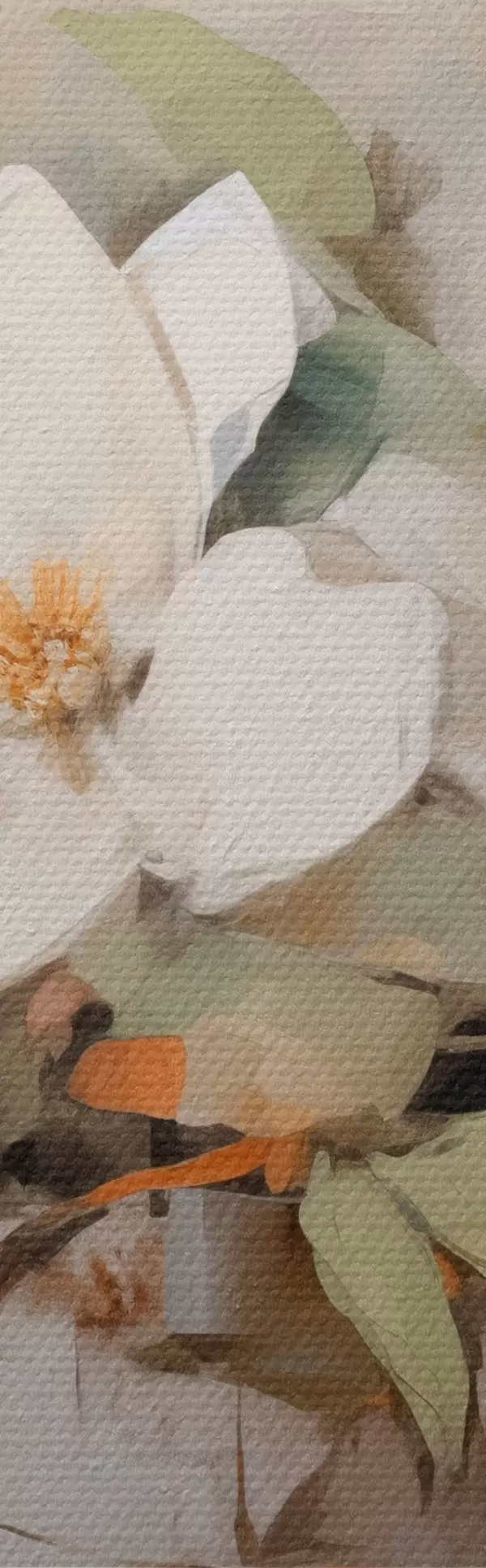 Glezna Balti magnolijas ziedi ar zaļām lapām uz zara, maigi triepieni ar otu, pieklusinātas krāsas Nr s44404