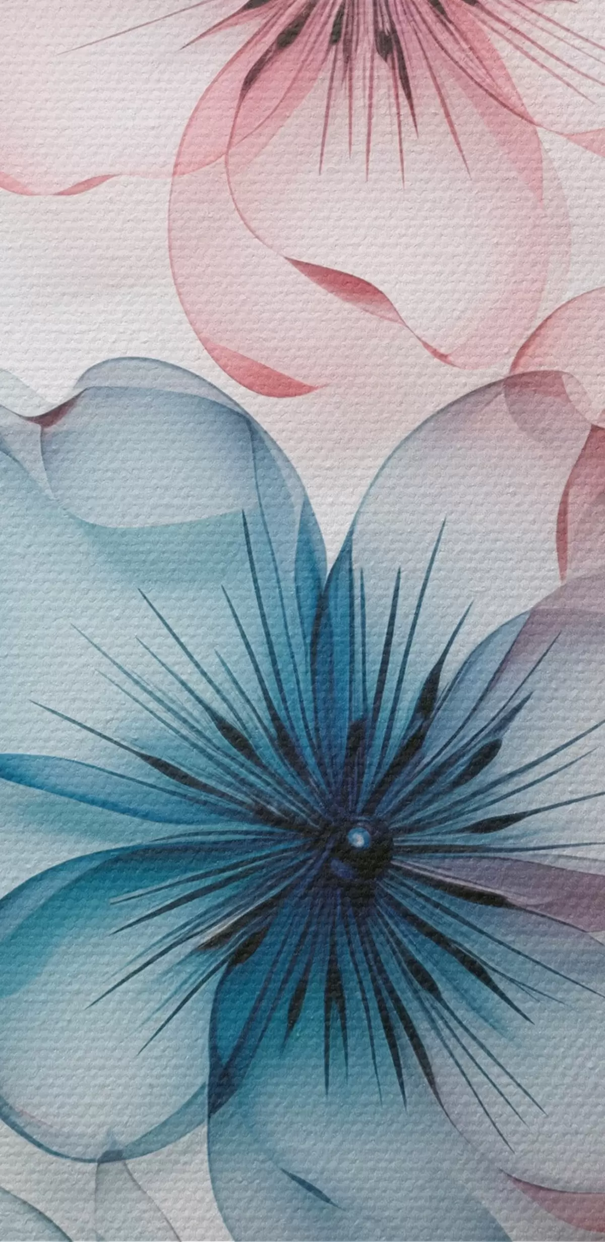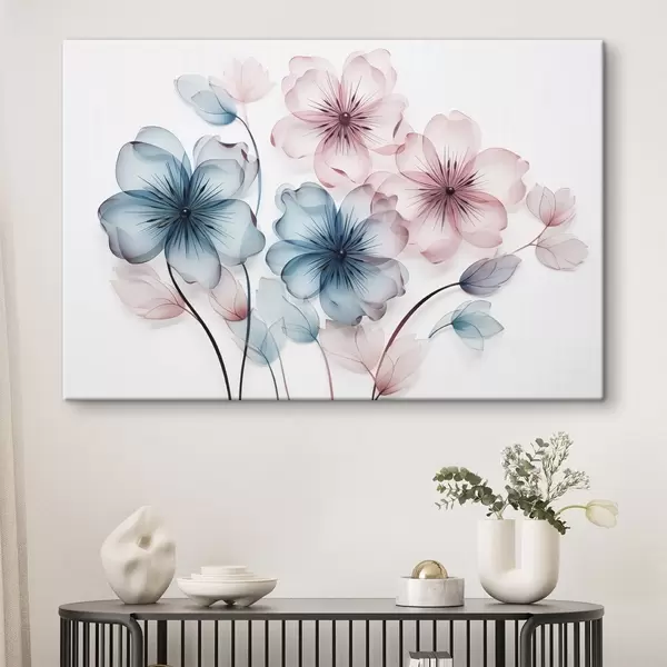Glezna Caurspīdīgi, piesātināti rozā un zili ziedi ar redzamiem kociņiem un kātiņiem s44405