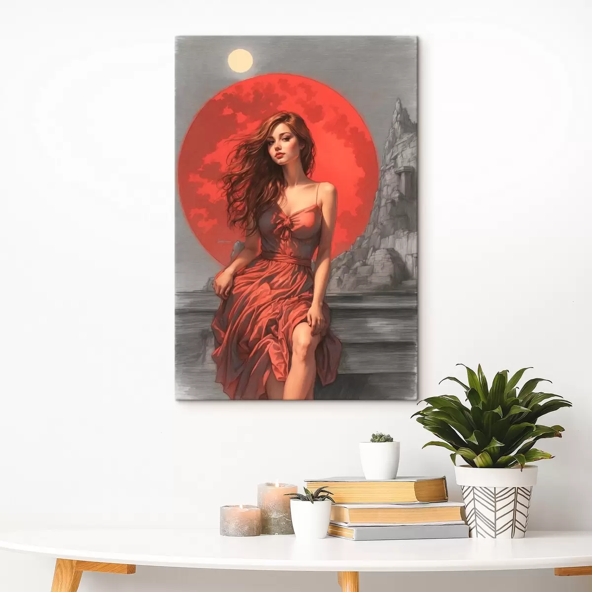 Glezna Meitene uz sarkana mēness fona Nr s44448