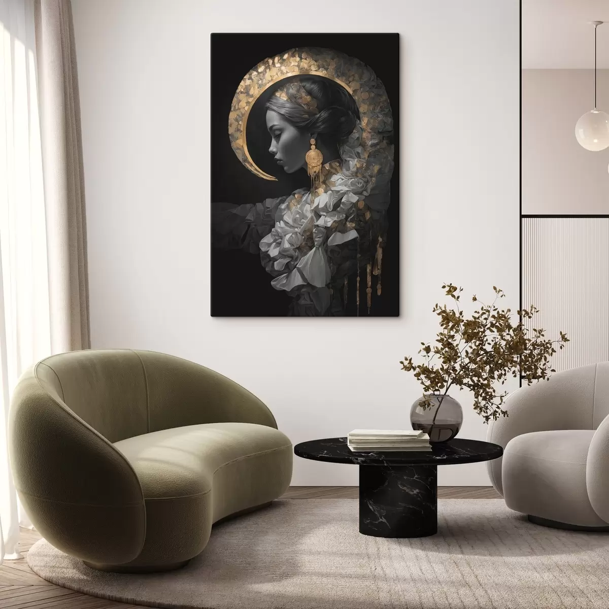 Glezna Meitene un dzeltens pusmēness uz melna fona Nr s44449