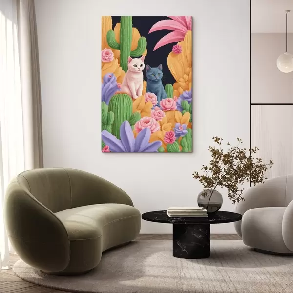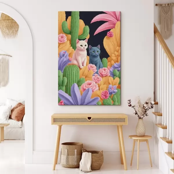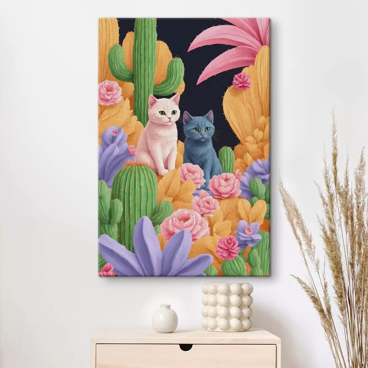 Glezna Mākslīgie kaķi starp ziediem un kaktusiem s44452
