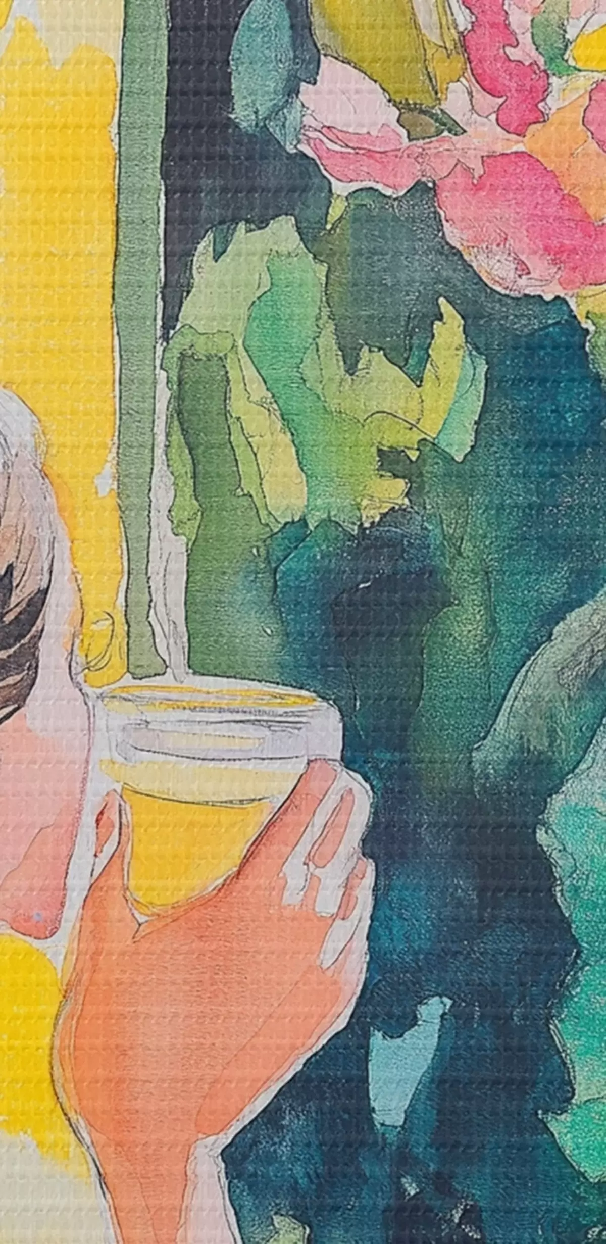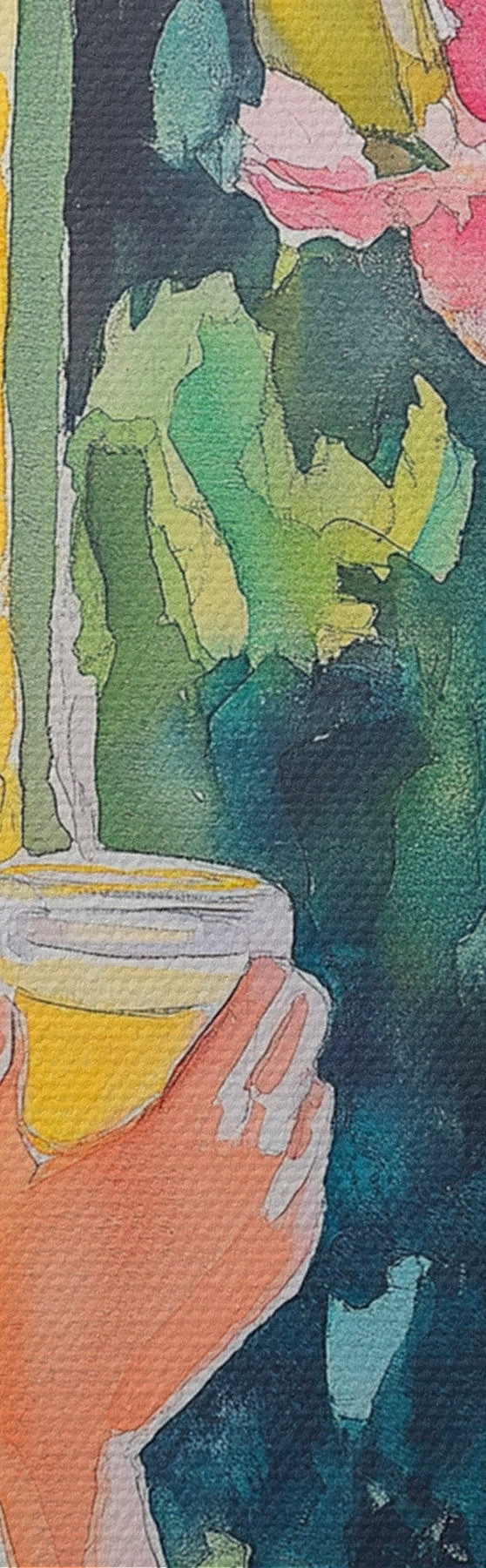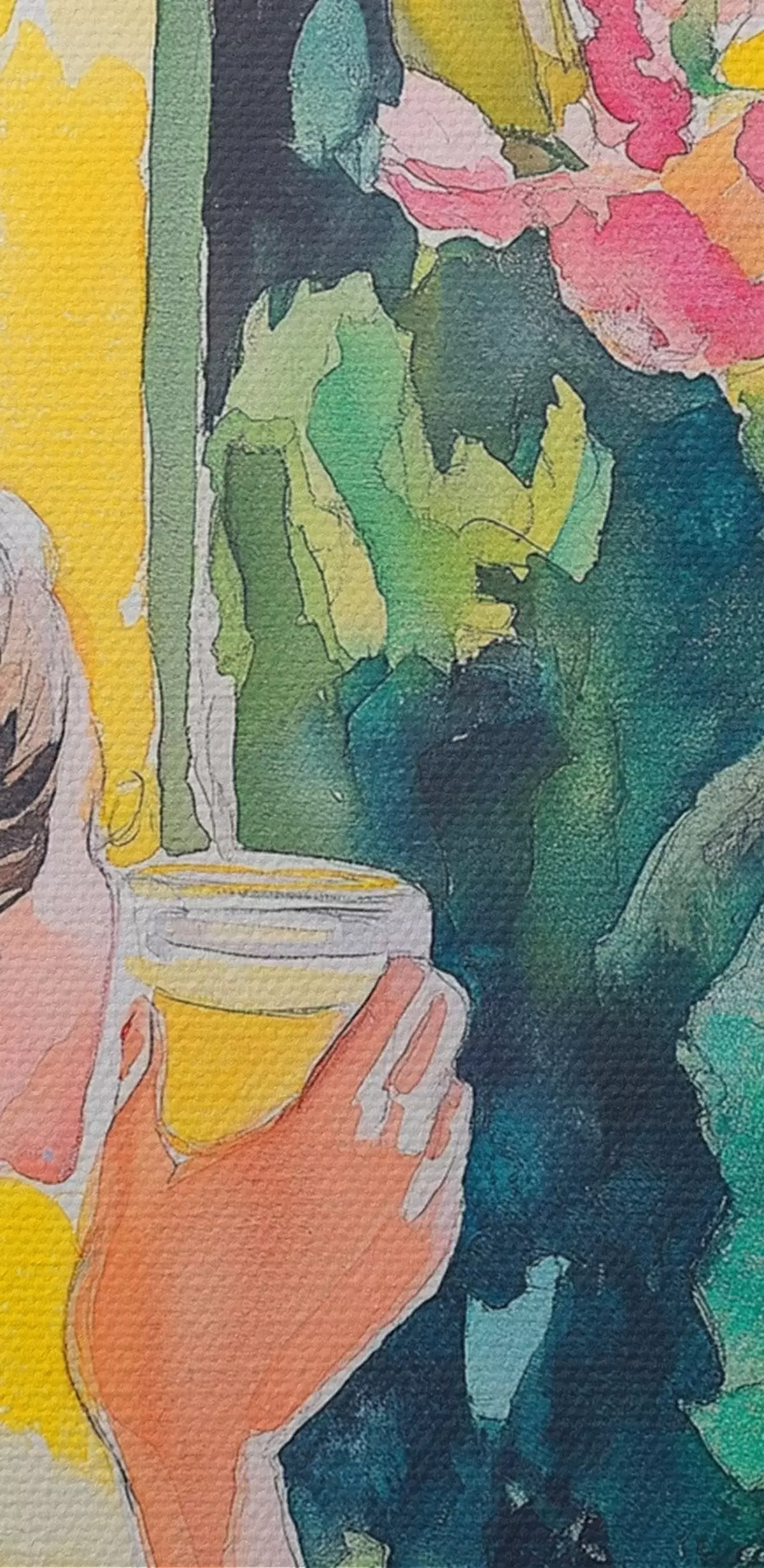 Glezna Vasaras vibrācijas, meitene kafejnīcā, limoncello, Itālija, akvareļu stils s44505