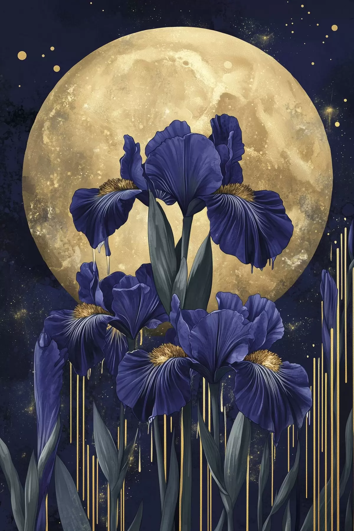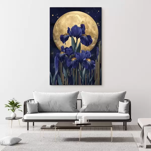 Glezna Īrisu ziedi, mirdzošs mēness, nakts debesis, zilas krāsas Nr s44510