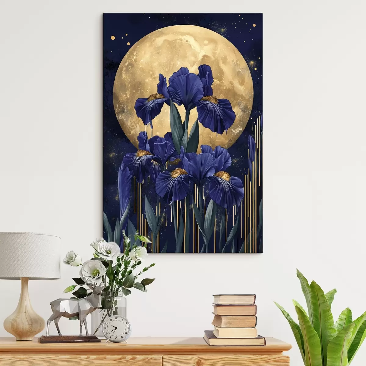 Glezna Īrisu ziedi, mirdzošs mēness, nakts debesis, zilas krāsas s44510