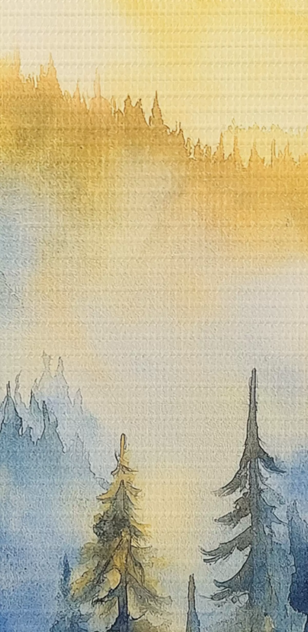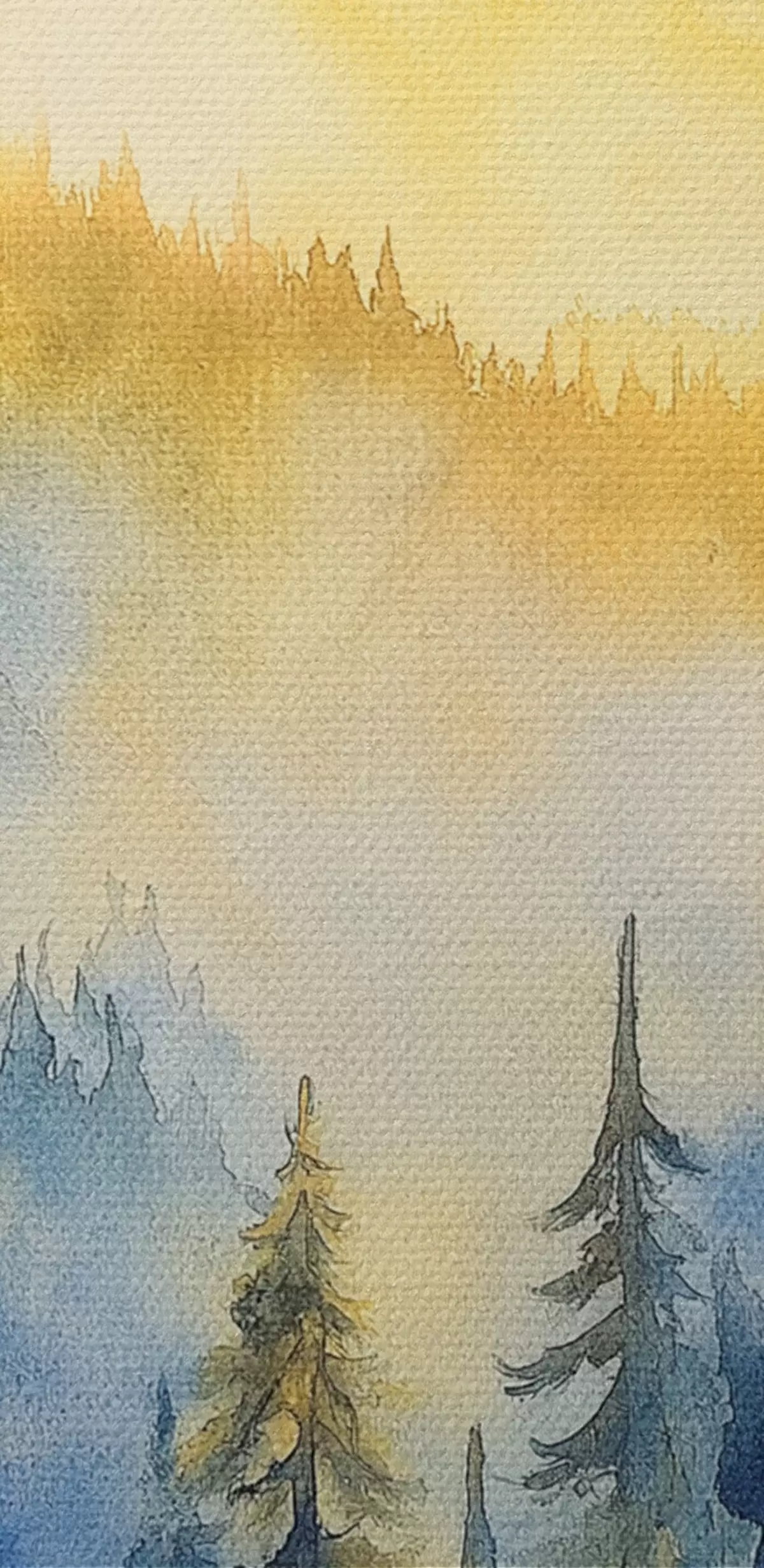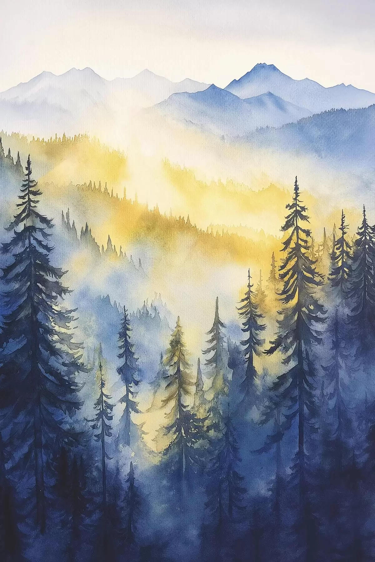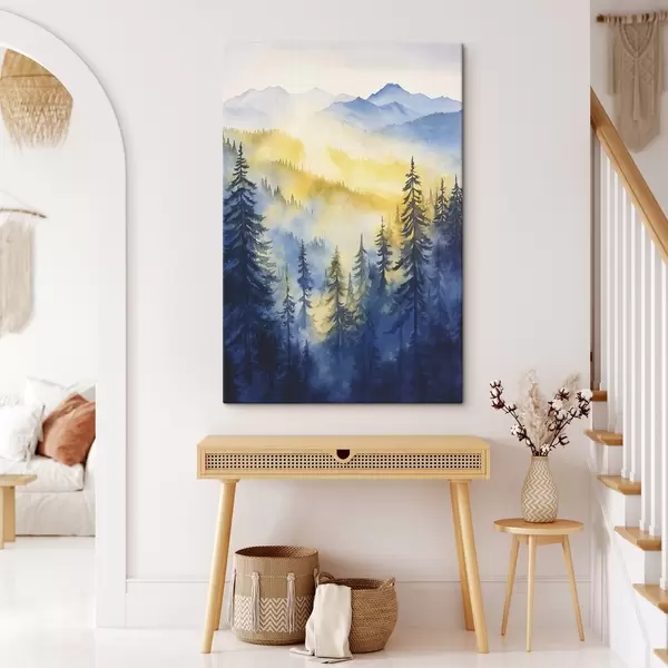 Glezna Miglaini kalni saullēktā, priežu meži, zilas un dzeltenas krāsas s44602