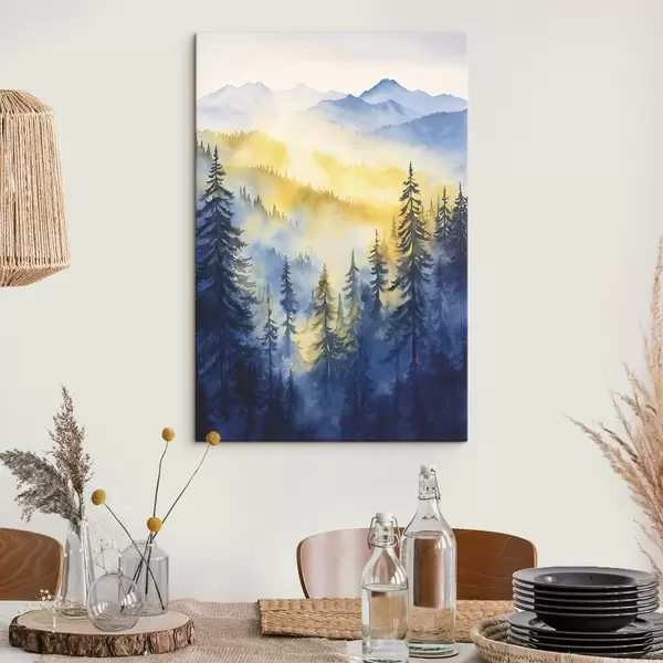 Glezna Miglaini kalni saullēktā, priežu meži, zilas un dzeltenas krāsas s44602