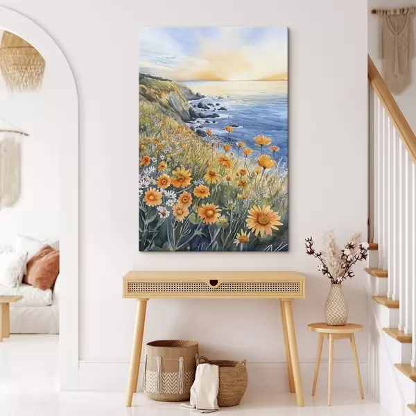 Glezna Klints ar oranžiem ziediem, okeāna piekraste, Portugāle, akvareļu stilā Nr s44604