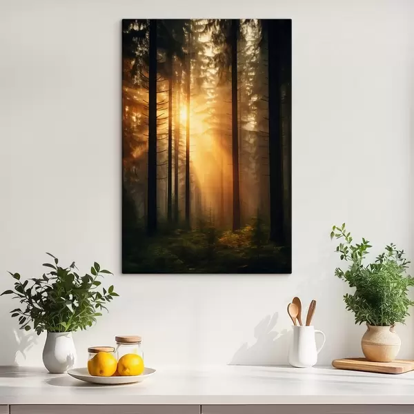 Glezna Blīvs priežu mežs ar saulrieta gaismu, reālisms, daba Nr s44615