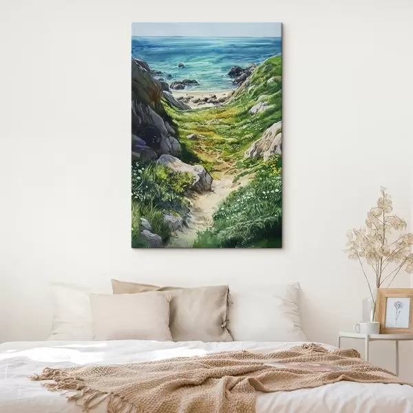 Glezna Jūras piekraste ar akmeņiem un zaļu zāli, akvareļu stilā, vasara Nr s44616