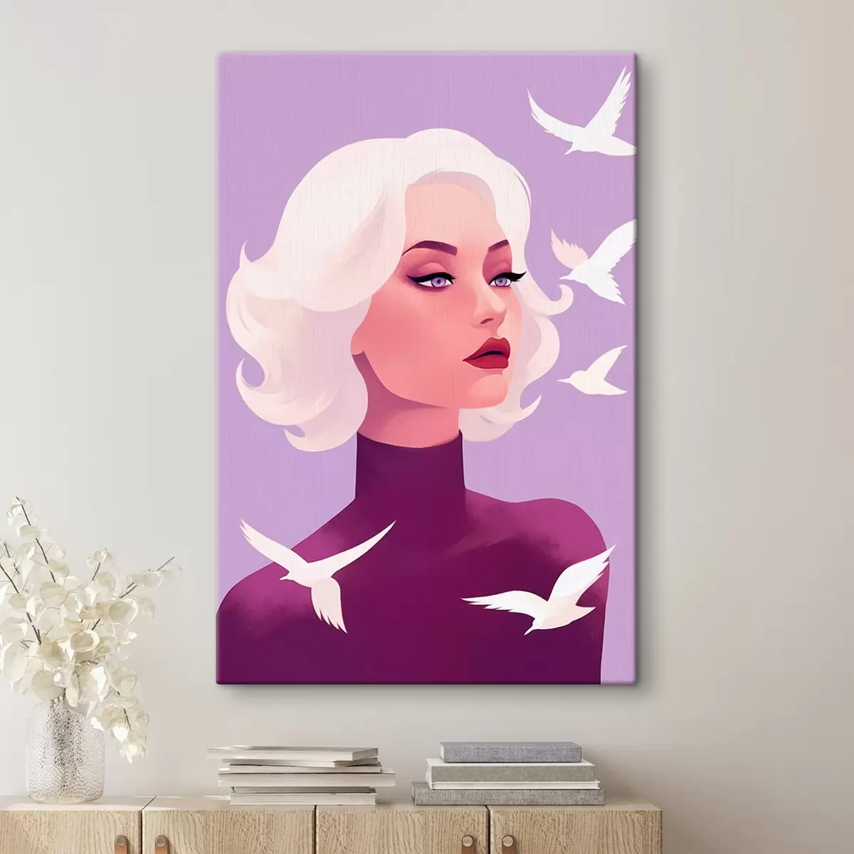 Glezna Sievietes portrets ar baltiem matiem uz fona ar putniem s44681