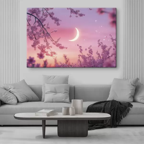 Glezna Ķiršu ziedi, rozā debesis ar mirdzošu mēnesi, reālisms Nr s44715
