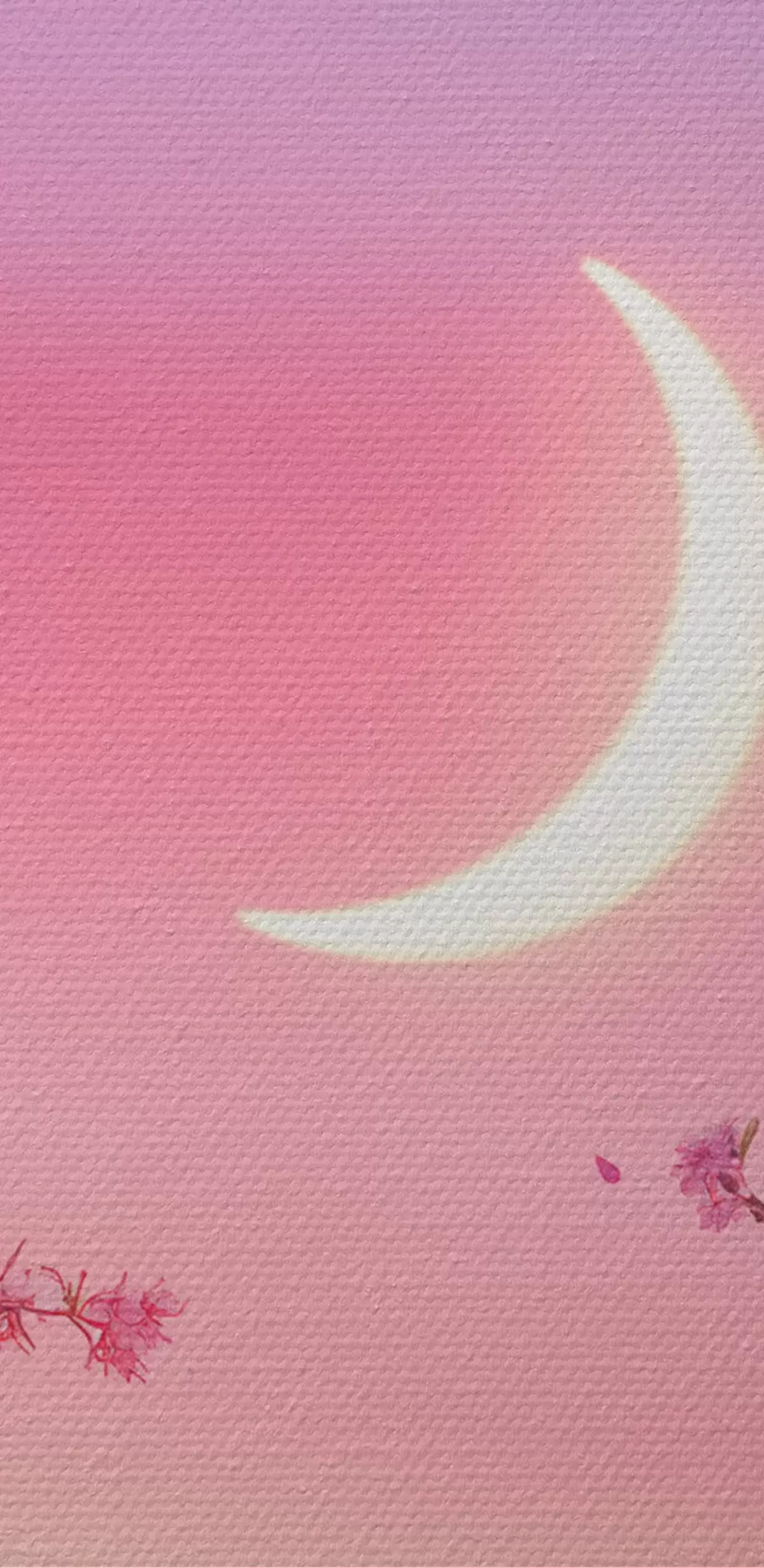 Glezna Ķiršu ziedi, rozā debesis ar mirdzošu mēnesi, reālisms s44715