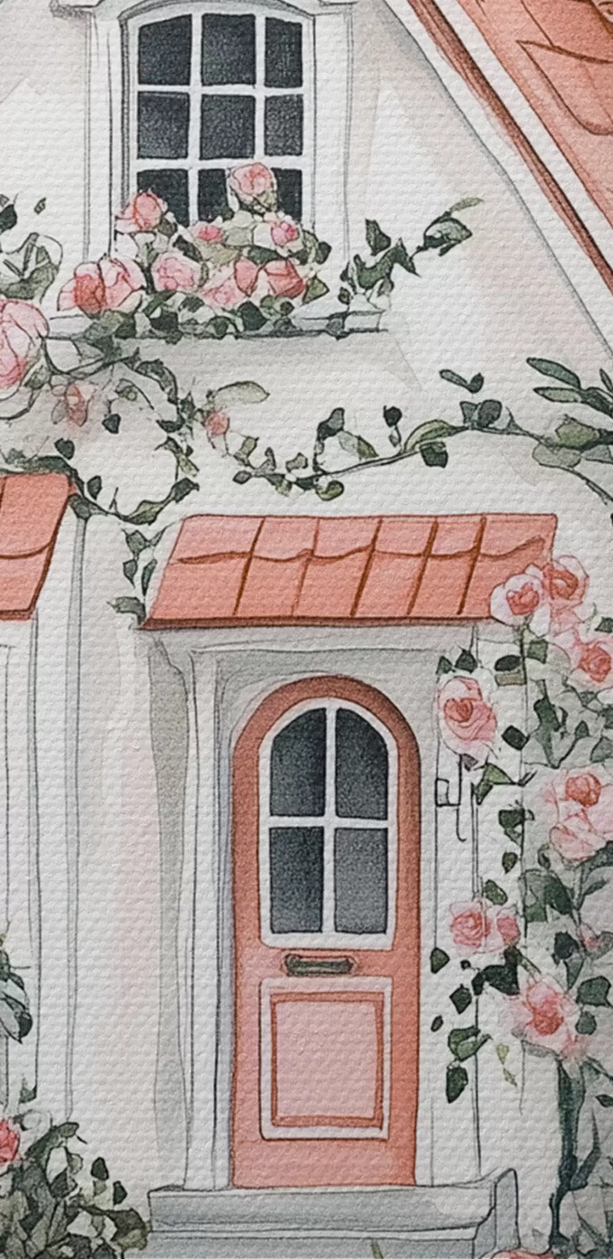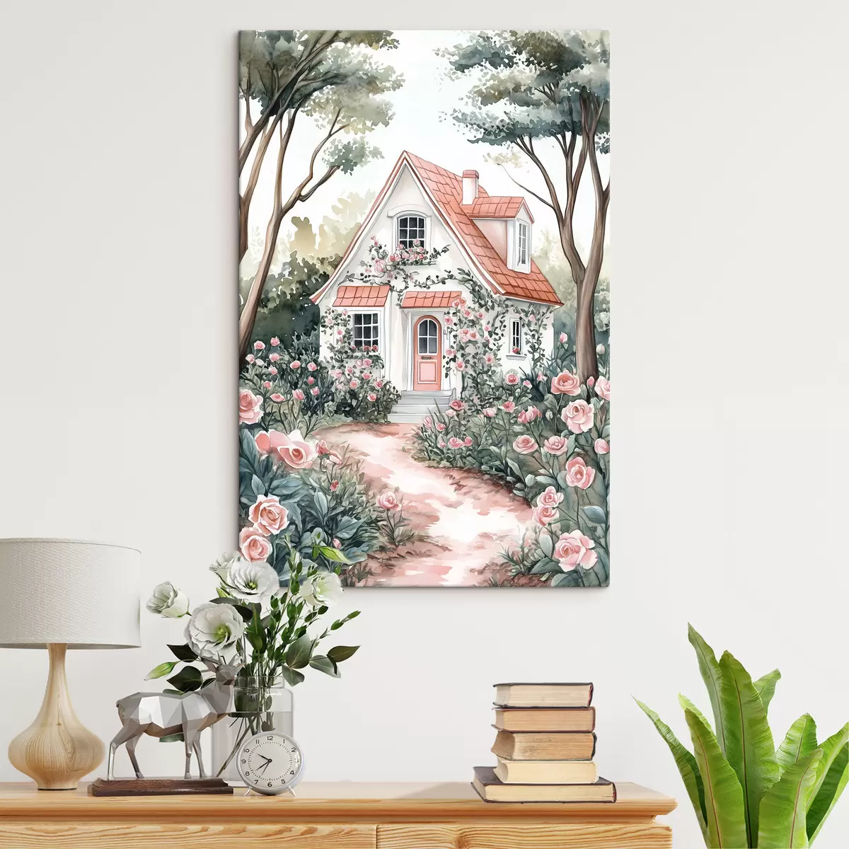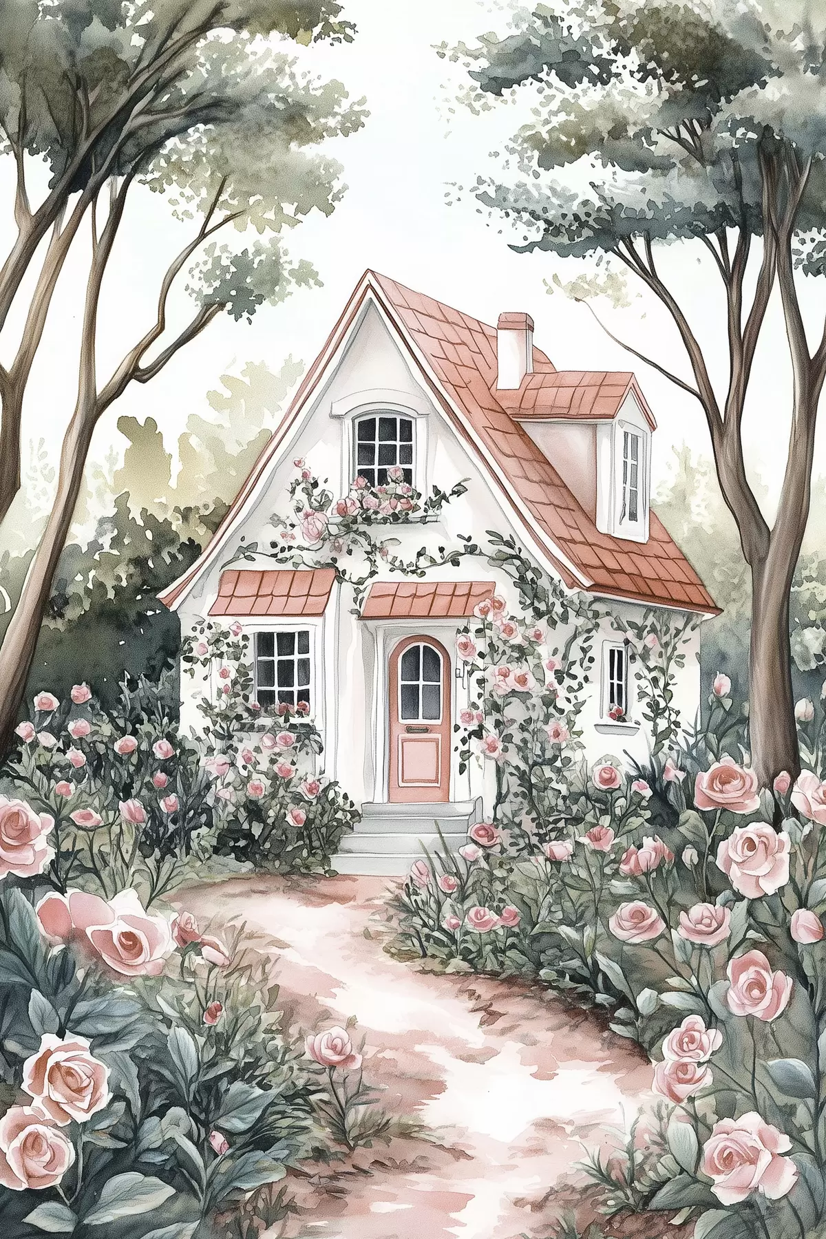 Glezna Baltā māja ar rožu dārzu mežā s44716
